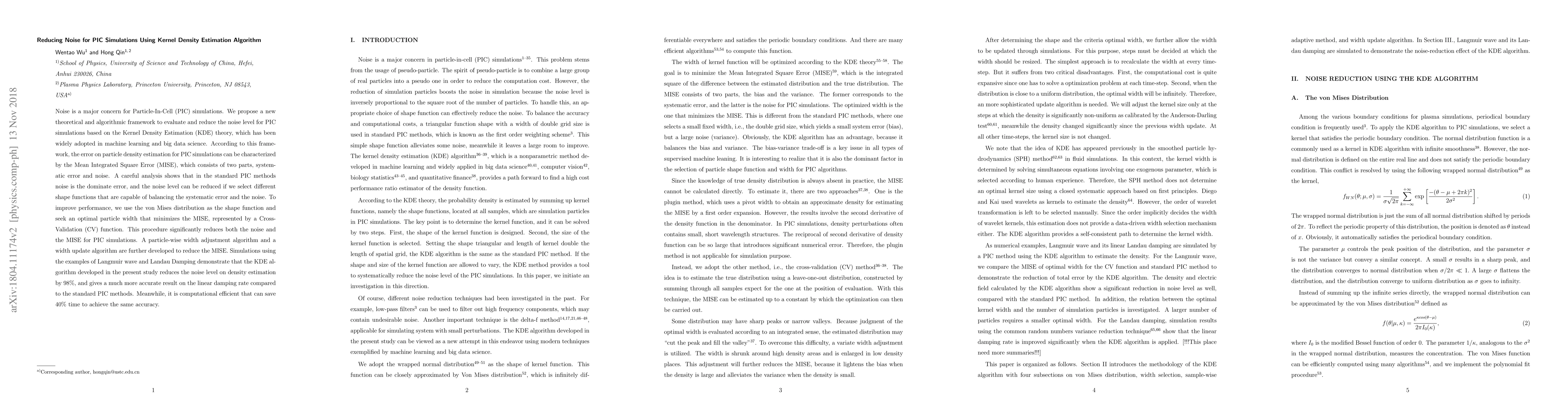 The research introduces a Kernel Density Estimation (KDE) based framework to reduce noise in Particle-In-Cell (PIC) simulations, characterizing error via Mean Integrated Square Error (MISE). Utilizing the von Mises distribution as a shape function and optimizing particle width through Cross-Validation, the method significantly decreases noise by 98% and improves accuracy in damping rate estimation for Langmuir wave and Landau Damping simulations, while reducing computational time by 40%.
