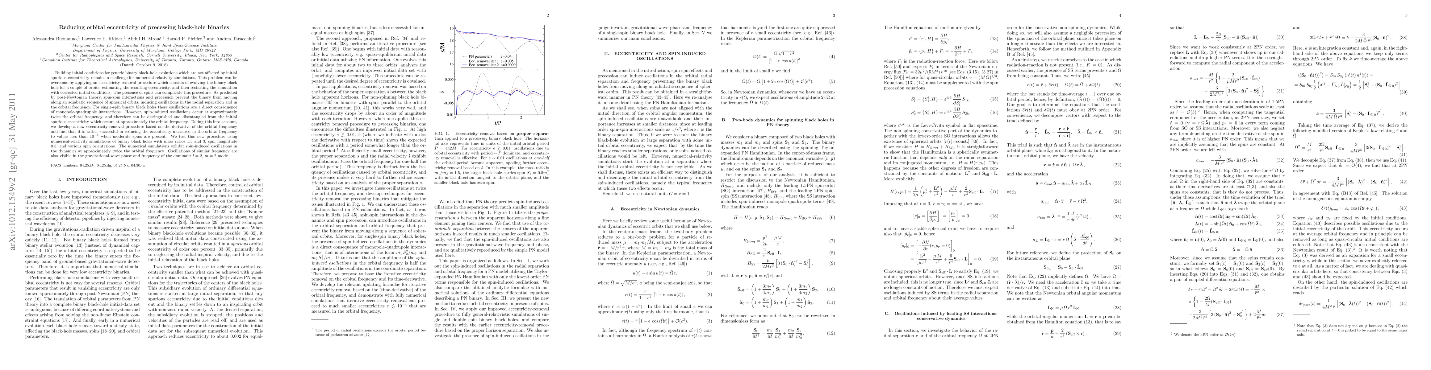 This paper proposes a new method to reduce orbital eccentricity in precessing black-hole binaries during numerical-relativity simulations by evolving the binary for a few orbits and correcting initial conditions. The method successfully minimizes eccentricity to less than 0.0001, even with moderate spins, by distinguishing spin-induced oscillations at twice the orbital frequency from initial spurious eccentricity.