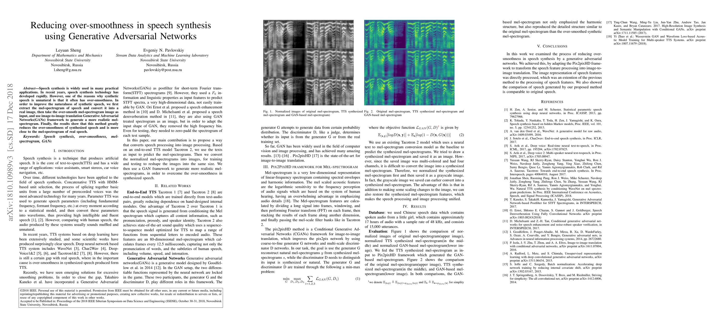 This paper proposes using Generative Adversarial Networks (GANs) to reduce over-smoothness in synthetic speech by transforming over-smooth mel-spectrogram images into more realistic versions, resulting in more natural-sounding synthesized speech. The method shows significant improvement in the naturalness of the synthesized speech compared to real speech.