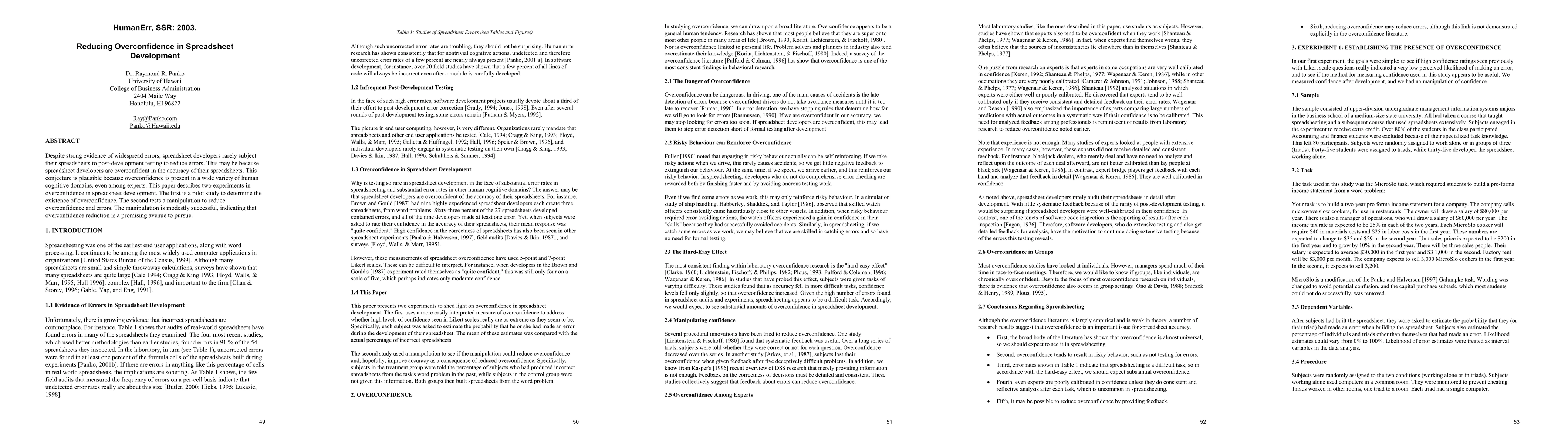 This paper investigates overconfidence in spreadsheet development, finding that developers rarely test their work despite error prevalence. Experiments reveal overconfidence's presence and show a modest success in reducing it, suggesting potential for error reduction through overconfidence mitigation.