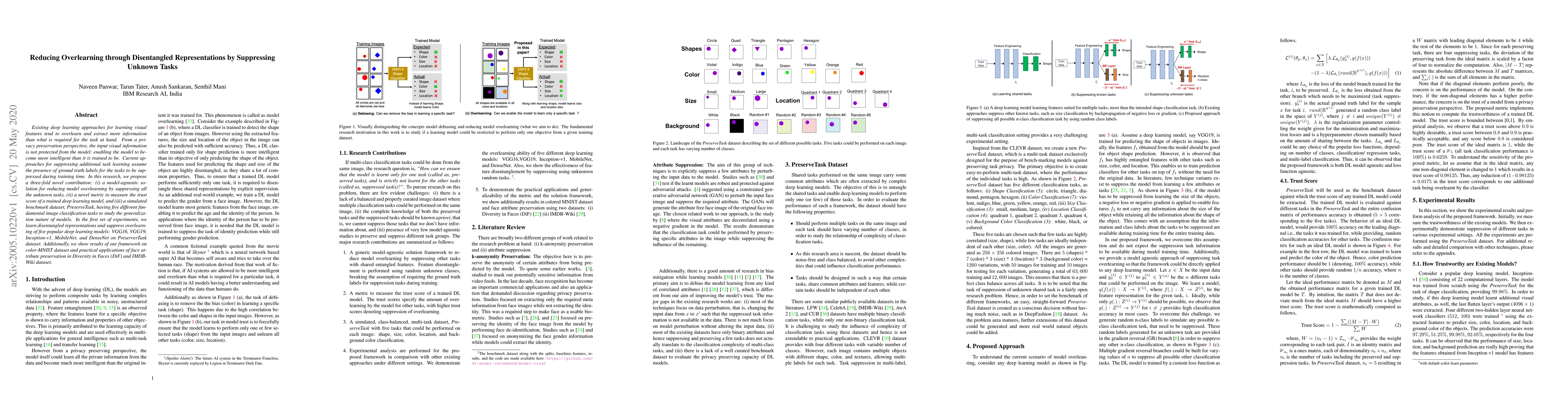 Existing deep learning approaches for learning visual features tend to overlearn and extract more information than what is required for the task at hand. From a privacy preservation perspective, the input visual information is not protected from the model; enabling the model to become more intelligent than it is trained to be. Current approaches for suppressing additional task learning assume the presence of ground truth labels for the tasks to be suppressed during training time. In this research, we propose a three-fold novel contribution: (i) a model-agnostic solution for reducing model overlearning by suppressing all the unknown tasks, (ii) a novel metric to measure the trust score of a trained deep learning model, and (iii) a simulated benchmark dataset, PreserveTask, having five different fundamental image classification tasks to study the generalization nature of models. In the first set of experiments, we learn disentangled representations and suppress overlearning of five popular deep learning models: VGG16, VGG19, Inception-v1, MobileNet, and DenseNet on PreserverTask dataset. Additionally, we show results of our framework on color-MNIST dataset and practical applications of face attribute preservation in Diversity in Faces (DiF) and IMDB-Wiki dataset.