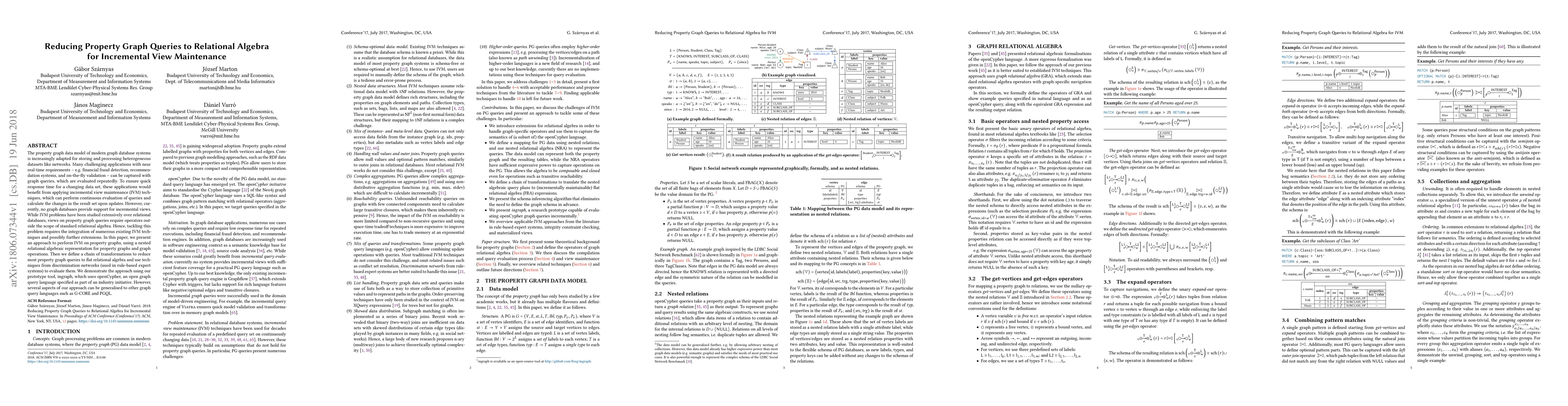 This paper proposes an approach to implement incremental view maintenance (IVM) for property graph queries by transforming them into relational algebra. The authors introduce a nested relational algebraic representation for property graphs and define a series of transformations to evaluate graph queries incrementally, leveraging techniques from discrimination networks. The method is demonstrated using a prototype tool, ingraph, which supports openCypher and can potentially be extended to other graph query languages.