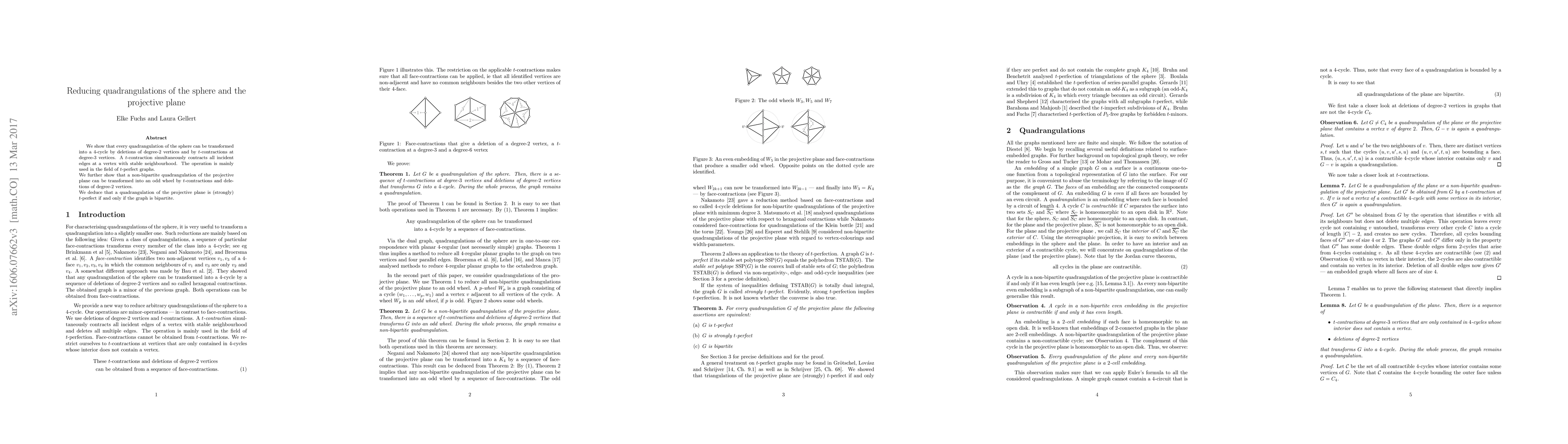We show that every quadrangulation of the sphere can be transformed into a $4$-cycle by deletions of degree-$2$ vertices and by $t$-contractions at degree-$3$ vertices. A $t$-contraction simultaneously contracts all incident edges at a vertex with stable neighbourhood. The operation is mainly used in the field of $t$-perfect graphs. We further show that a non-bipartite quadrangulation of the projective plane can be transformed into an odd wheel by $t$-contractions and deletions of degree-$2$ vertices. We deduce that a quadrangulation of the projective plane is (strongly) $t$-perfect if and only if the graph is bipartite.