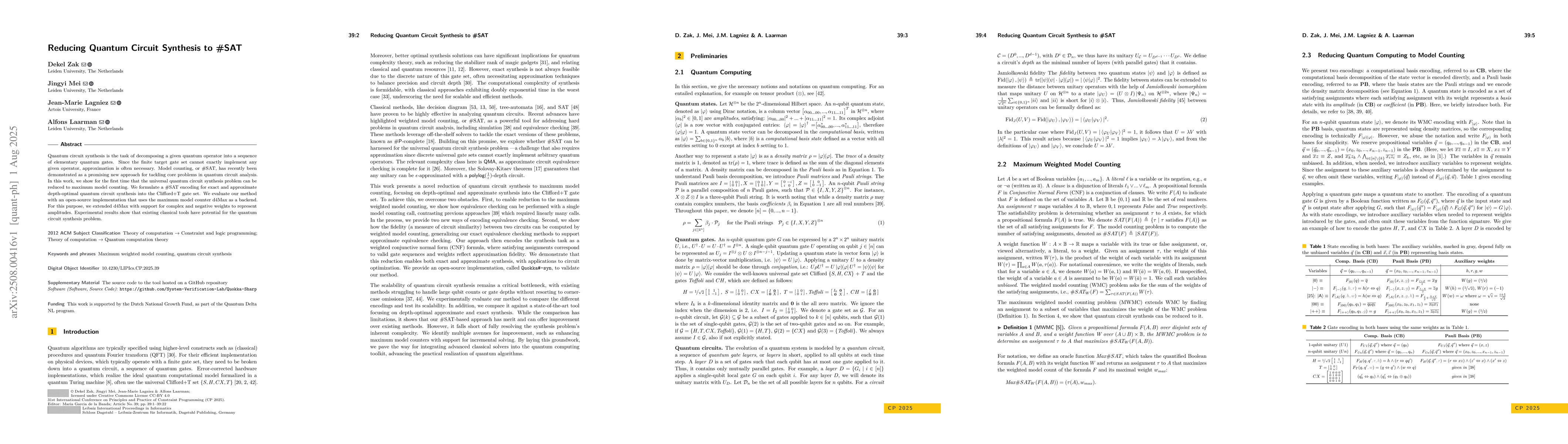 Quantum circuit synthesis is the task of decomposing a given quantum operator into a sequence of elementary quantum gates. Since the finite target gate set cannot exactly implement any given operator, approximation is often necessary. Model counting, or #SAT, has recently been demonstrated as a promising new approach for tackling core problems in quantum circuit analysis. In this work, we show for the first time that the universal quantum circuit synthesis problem can be reduced to maximum model counting. We formulate a #SAT encoding for exact and approximate depth-optimal quantum circuit synthesis into the Clifford+T gate set. We evaluate our method with an open-source implementation that uses the maximum model counter d4Max as a backend. For this purpose, we extended d4Max with support for complex and negative weights to represent amplitudes. Experimental results show that existing classical tools have potential for the quantum circuit synthesis problem.