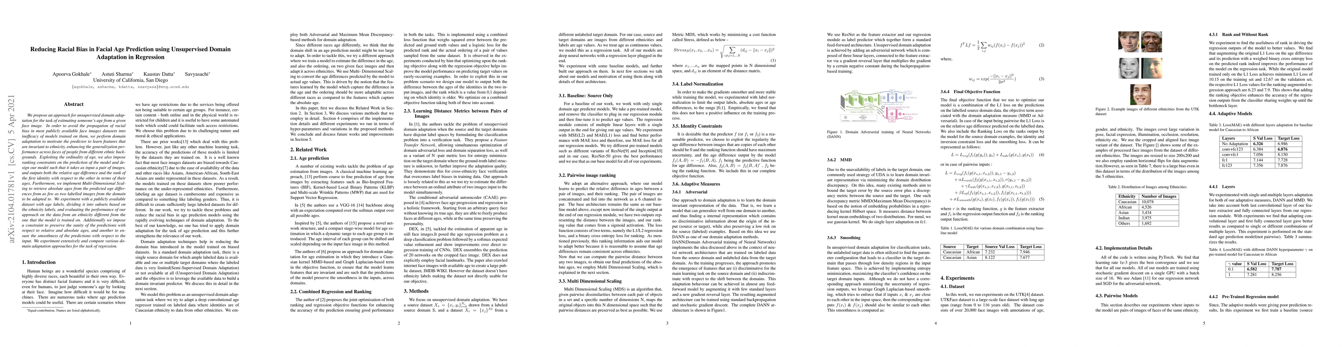 We propose an approach for unsupervised domain adaptation for the task of estimating someone's age from a given face image. In order to avoid the propagation of racial bias in most publicly available face image datasets into the inefficacy of models trained on them, we perform domain adaptation to motivate the predictor to learn features that are invariant to ethnicity, enhancing the generalization performance across faces of people from different ethnic backgrounds. Exploiting the ordinality of age, we also impose ranking constraints on the prediction of the model and design our model such that it takes as input a pair of images, and outputs both the relative age difference and the rank of the first identity with respect to the other in terms of their ages. Furthermore, we implement Multi-Dimensional Scaling to retrieve absolute ages from the predicted age differences from as few as two labeled images from the domain to be adapted to. We experiment with a publicly available dataset with age labels, dividing it into subsets based on the ethnicity labels, and evaluating the performance of our approach on the data from an ethnicity different from the one that the model is trained on. Additionally, we impose a constraint to preserve the sanity of the predictions with respect to relative and absolute ages, and another to ensure the smoothness of the predictions with respect to the input. We experiment extensively and compare various domain adaptation approaches for the task of regression.
