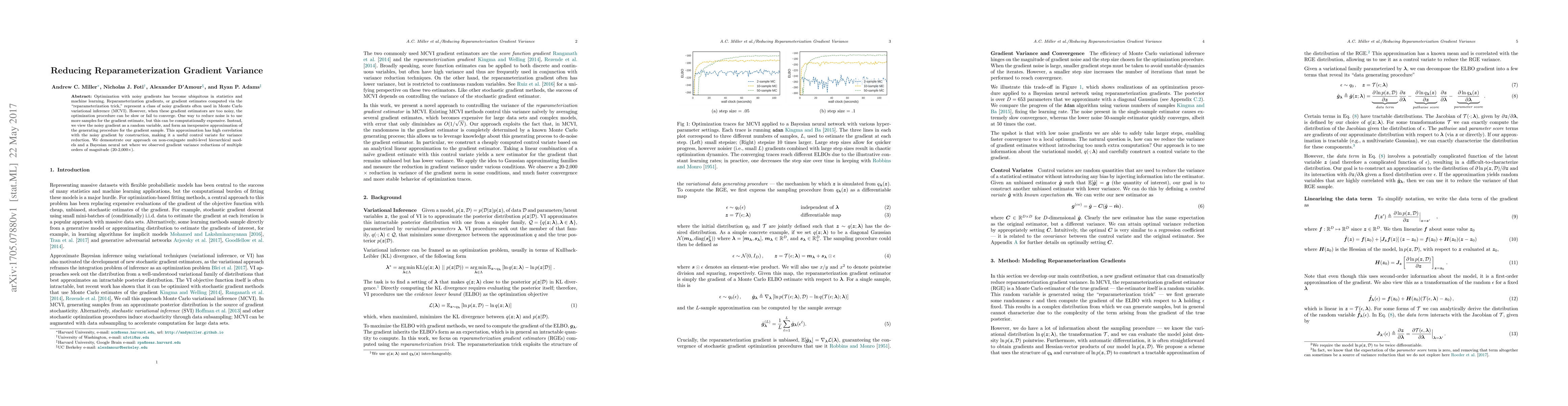 Optimization with noisy gradients has become ubiquitous in statistics and machine learning. Reparameterization gradients, or gradient estimates computed via the "reparameterization trick," represent a class of noisy gradients often used in Monte Carlo variational inference (MCVI). However, when these gradient estimators are too noisy, the optimization procedure can be slow or fail to converge. One way to reduce noise is to use more samples for the gradient estimate, but this can be computationally expensive. Instead, we view the noisy gradient as a random variable, and form an inexpensive approximation of the generating procedure for the gradient sample. This approximation has high correlation with the noisy gradient by construction, making it a useful control variate for variance reduction. We demonstrate our approach on non-conjugate multi-level hierarchical models and a Bayesian neural net where we observed gradient variance reductions of multiple orders of magnitude (20-2,000x).