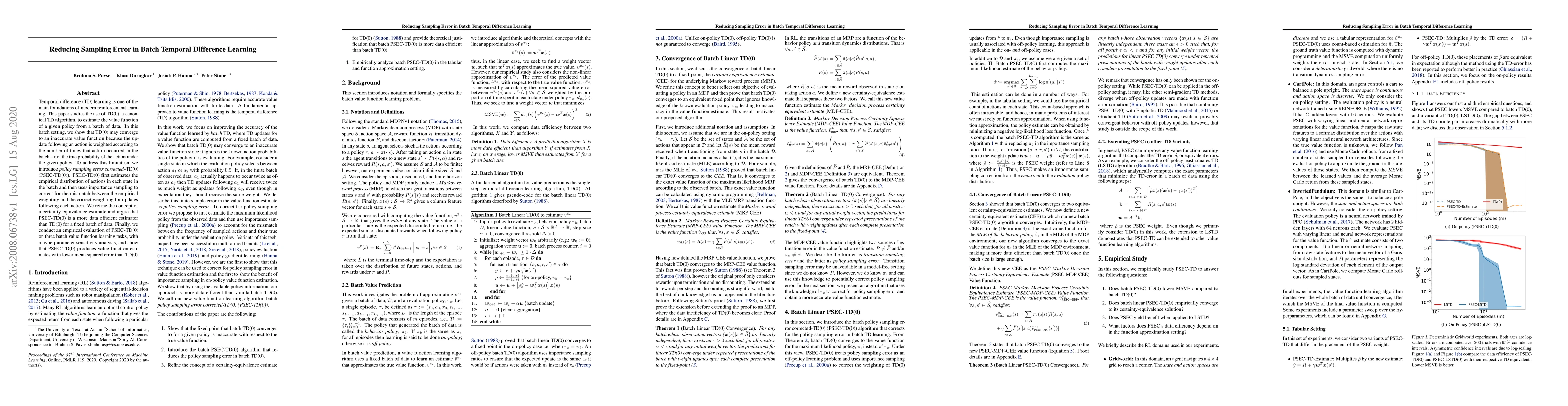 This paper proposes PSEC-TD(0) to correct for sampling error in batch temporal difference learning, addressing inaccuracies in TD(0) due to action frequency discrepancies. PSEC-TD(0) uses importance sampling to adjust for empirical action distributions, demonstrating improved value function estimation and data efficiency over TD(0).