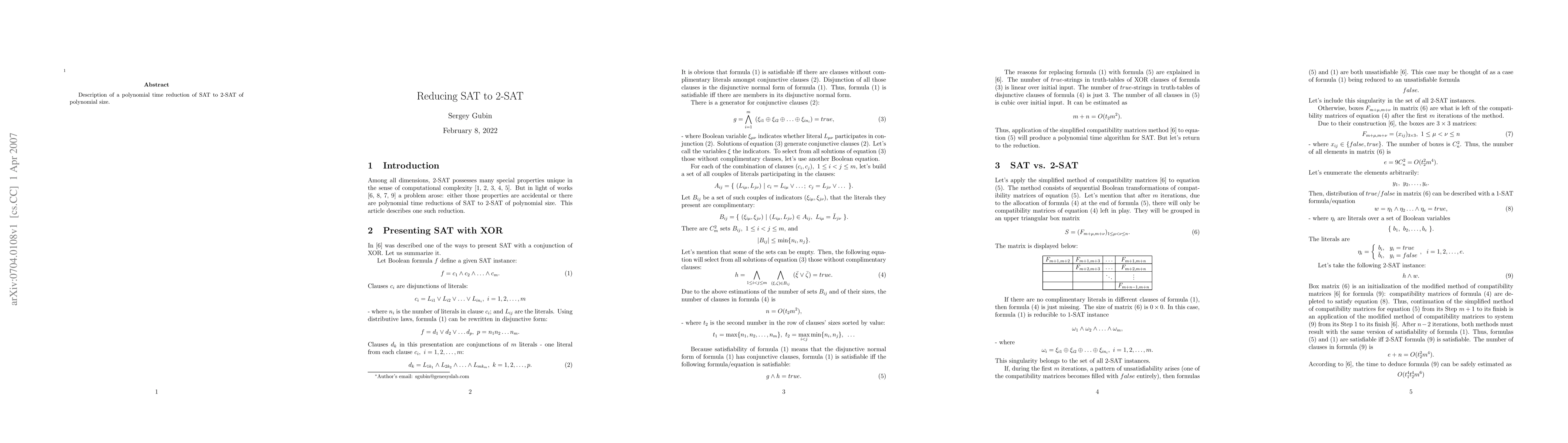 The use of compatibility matrices to reduce SAT to 2-SAT is a new and innovative approach in the field of computational complexity theory