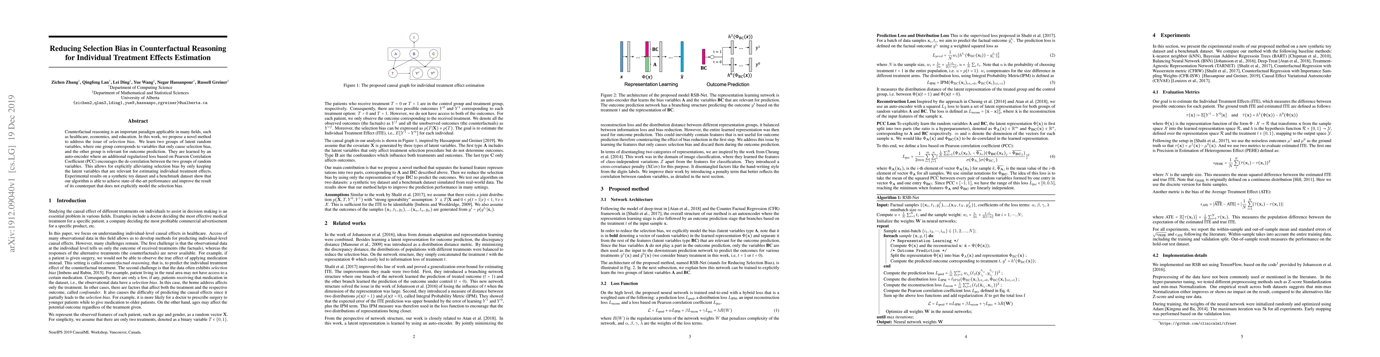This paper proposes a novel method to reduce selection bias in counterfactual reasoning for estimating individual treatment effects. It uses an auto-encoder with a regularized loss to learn latent variables, de-correlating those causing bias from those relevant for outcome prediction, achieving state-of-the-art performance in experiments.