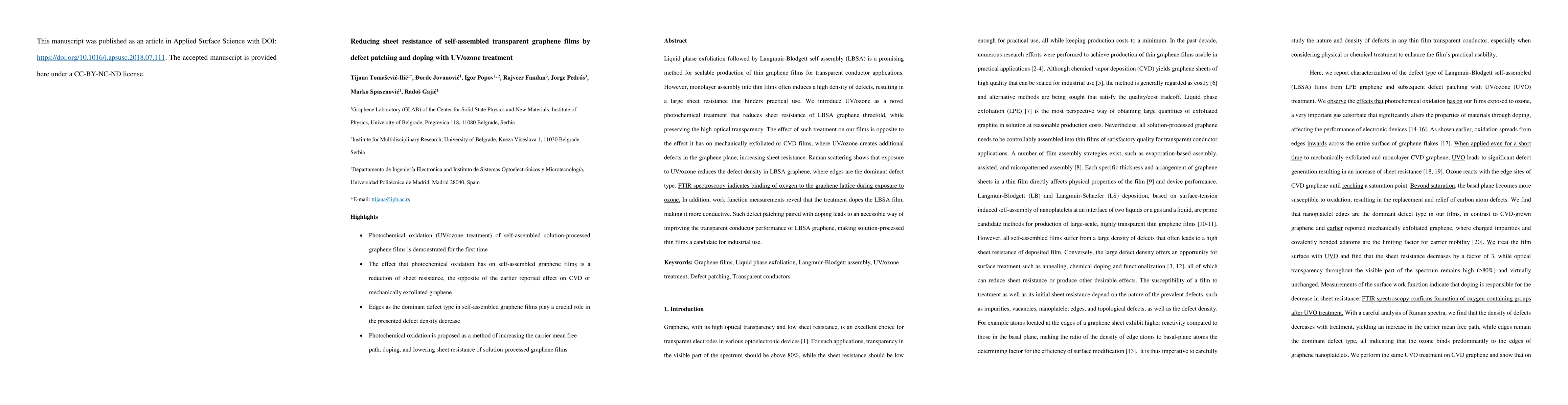 This paper presents a method using UV/ozone treatment to reduce the sheet resistance of self-assembled transparent graphene films, achieved by defect patching and doping, thereby enhancing their performance for transparent conductor applications. The treatment reduces defect density and increases conductivity, making solution-processed graphene films viable for industrial use.