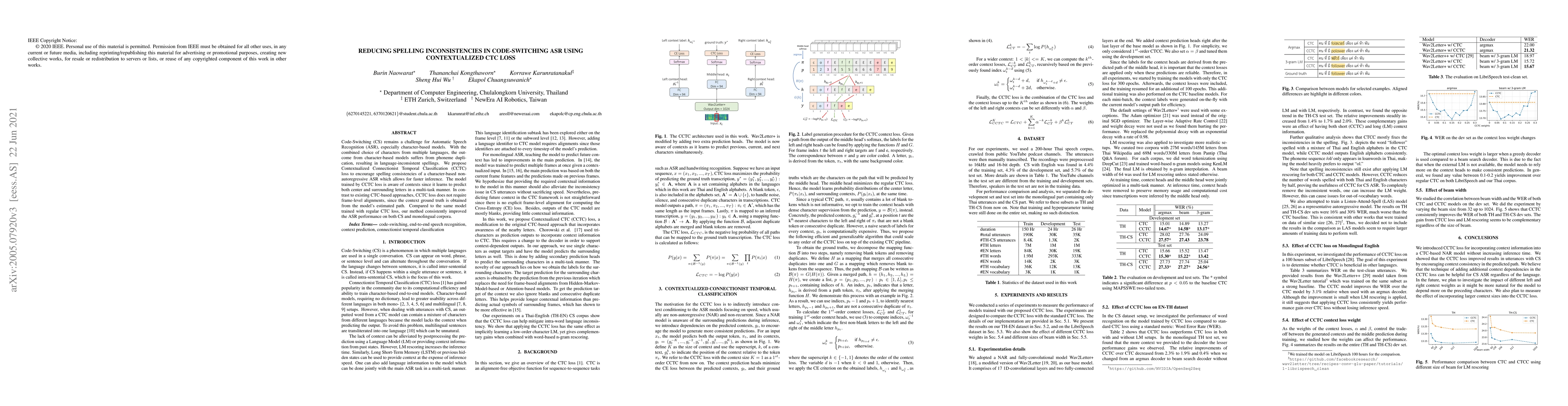 This paper proposes a Contextualized Connectionist Temporal Classification (CCTC) loss to improve spelling consistency in code-switching Automatic Speech Recognition (ASR) models. Unlike traditional CTC, CCTC loss conditions predictions on predicted contexts, enhancing language consistency without requiring frame-level alignments, leading to better performance on both code-switching and monolingual datasets.