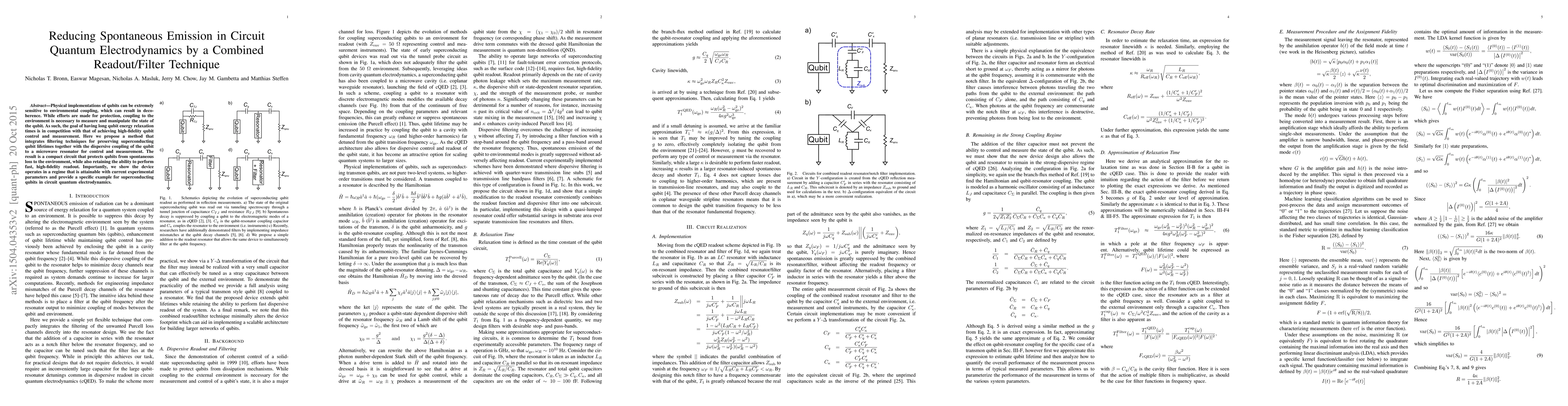 This paper proposes a combined readout/filter technique to reduce spontaneous emission in superconducting qubits, balancing long qubit lifetimes and high-fidelity measurement. The method leverages dispersive coupling with a microwave resonator, achieving protection from environmental loss while maintaining fast, accurate readout.