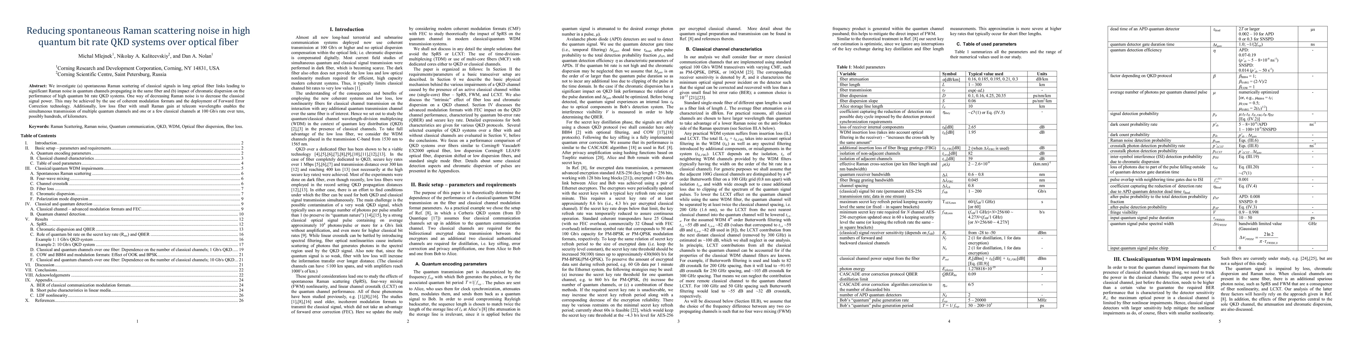 This paper explores methods to reduce Raman scattering noise in high quantum bit rate quantum key distribution (QKD) systems over optical fiber, focusing on the impact of classical signals and chromatic dispersion. Solutions include using coherent modulation formats and Forward Error Correction, along with low-loss fiber to enable the simultaneous transmission of multiple quantum and classical channels at high speeds over long distances.