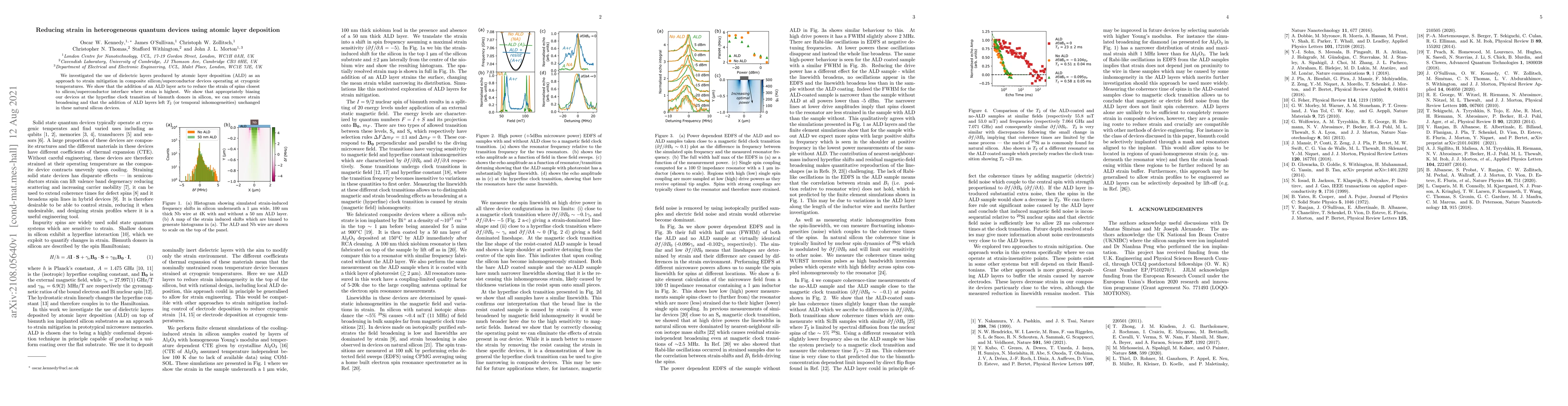 We investigated the use of dielectric layers produced by atomic layer deposition (ALD) as an approach to strain mitigation in composite silicon/superconductor devices operating at cryogenic temperatures. We show that the addition of an ALD layer acts to reduce the strain of spins closest to silicon/superconductor interface where strain is highest. We show that appropriately biasing our devices at the hyperfine clock transition of bismuth donors in silicon, we can remove strain broadening and that the addition of ALD layers left $T_2$ (or temporal inhomogeneities) unchanged in these natural silicon devices.