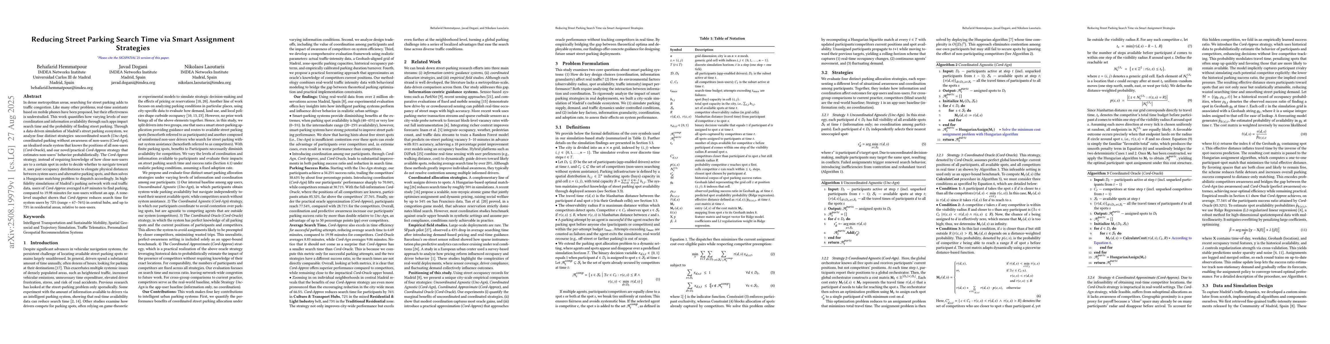 In dense metropolitan areas, searching for street parking adds to traffic congestion. Like many other problems, real-time assistants based on mobile phones have been proposed, but their effectiveness is understudied. This work quantifies how varying levels of user coordination and information availability through such apps impact search time and the probability of finding street parking. Through a data-driven simulation of Madrid's street parking ecosystem, we analyze four distinct strategies: uncoordinated search (Unc-Agn), coordinated parking without awareness of non-users (Cord-Agn), an idealized oracle system that knows the positions of all non-users (Cord-Oracle), and our novel/practical Cord-Approx strategy that estimates non-users' behavior probabilistically. The Cord-Approx strategy, instead of requiring knowledge of how close non-users are to a certain spot in order to decide whether to navigate toward it, uses past occupancy distributions to elongate physical distances between system users and alternative parking spots, and then solves a Hungarian matching problem to dispatch accordingly. In high-fidelity simulations of Madrid's parking network with real traffic data, users of Cord-Approx averaged 6.69 minutes to find parking, compared to 19.98 minutes for non-users without an app. A zone-level snapshot shows that Cord-Approx reduces search time for system users by 72% (range = 67-76%) in central hubs, and up to 73% in residential areas, relative to non-users.