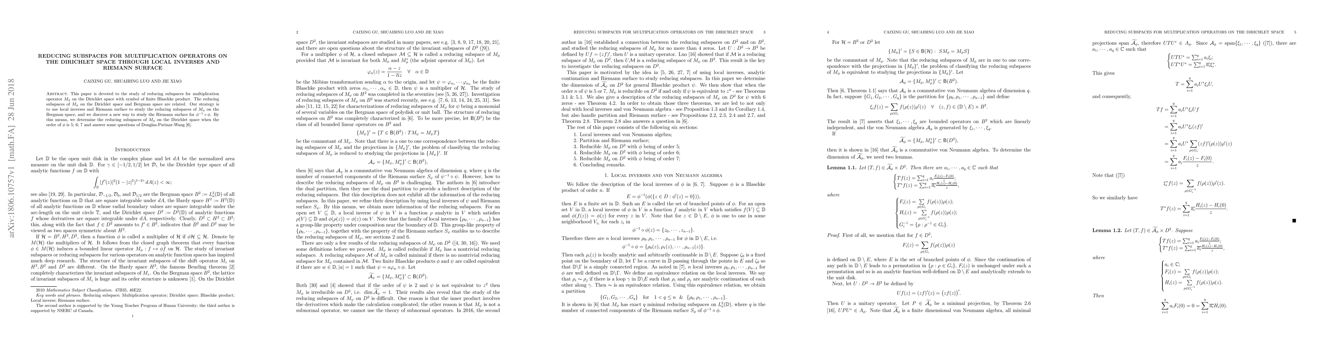 This paper explores reducing subspaces for multiplication operators on the Dirichlet space using local inverses and Riemann surface techniques. It determines reducing subspaces for specific orders of finite Blaschke products and resolves questions posed by Douglas-Putinar-Wang.