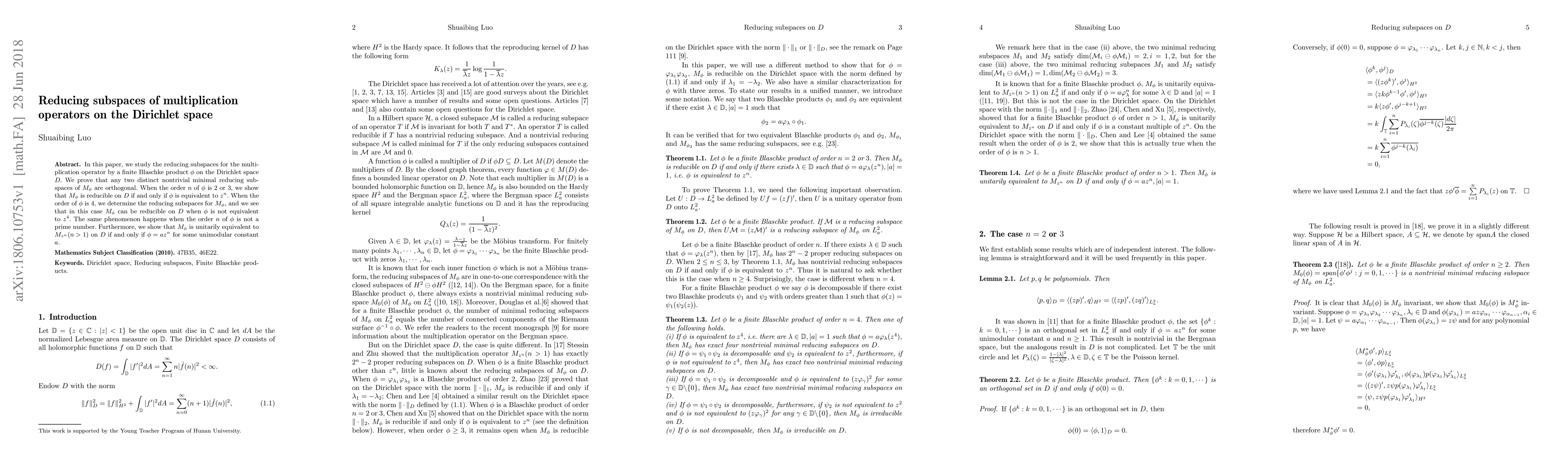 This paper investigates the reducing subspaces of multiplication operators by finite Blaschke products on the Dirichlet space, proving that distinct nontrivial minimal reducing subspaces are orthogonal. It also establishes conditions for reducibility based on the order of the Blaschke product, showing that for orders 2 or 3, reducibility occurs if and only if the product is $z^n$, while for order 4 or non-prime orders, reducibility can occur without the product being equivalent to $z^n$.