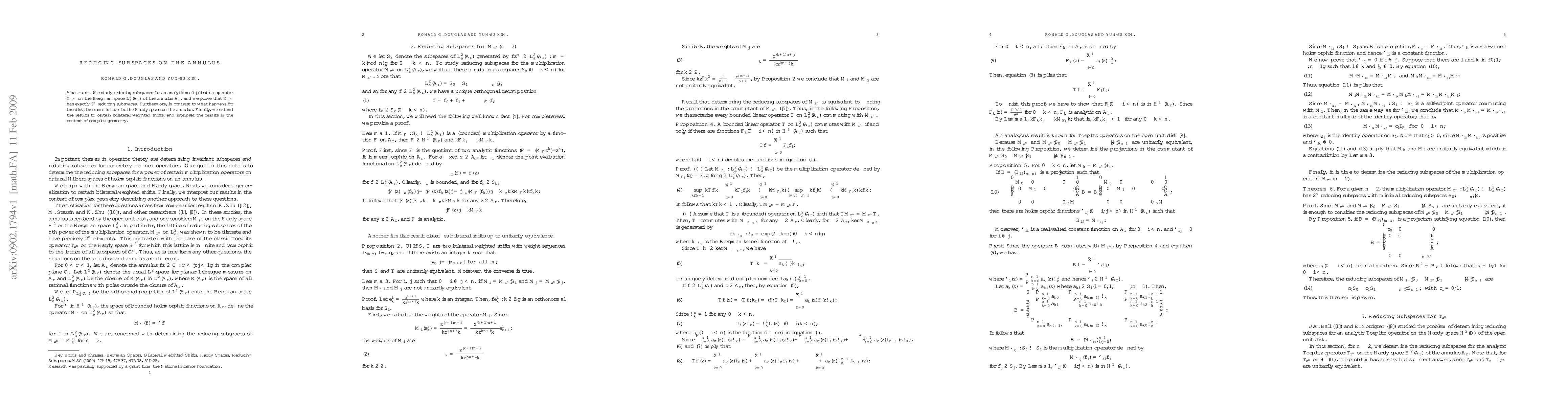 This paper investigates reducing subspaces for the analytic multiplication operator M_{z^{n}} on the Bergman space of the annulus, proving that it has exactly 2^n reducing subspaces. It also extends these findings to Hardy spaces on the annulus and bilateral weighted shifts, contextualizing the results within complex geometry.
