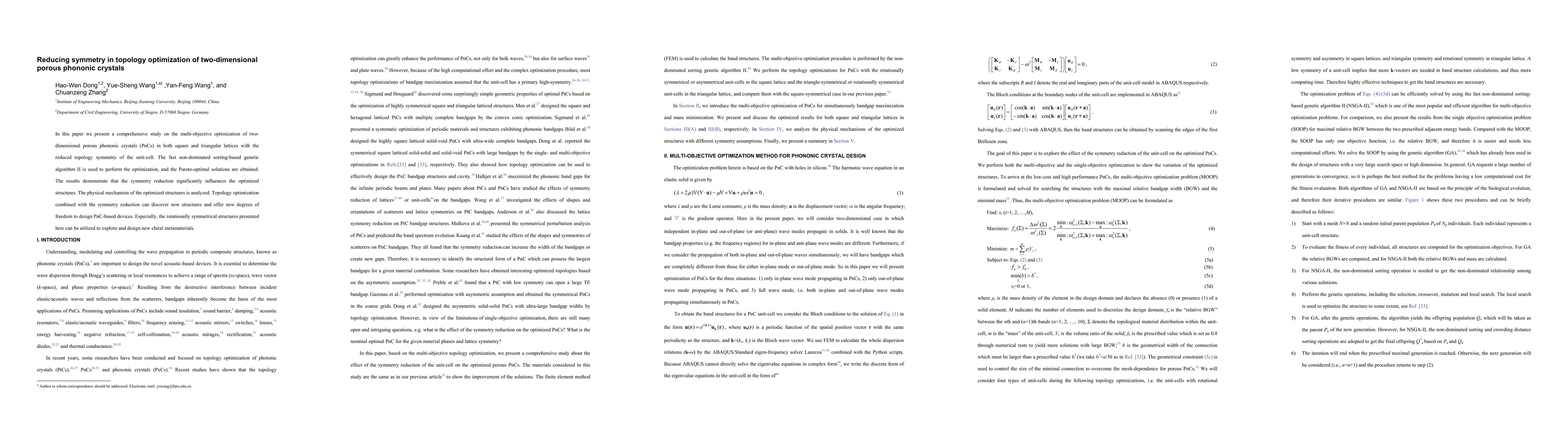 This paper explores multi-objective optimization of two-dimensional porous phononic crystals using a genetic algorithm, demonstrating that reducing symmetry in the unit-cell leads to significant structural changes. The study reveals new design possibilities for chiral metamaterials and PnC-based devices.