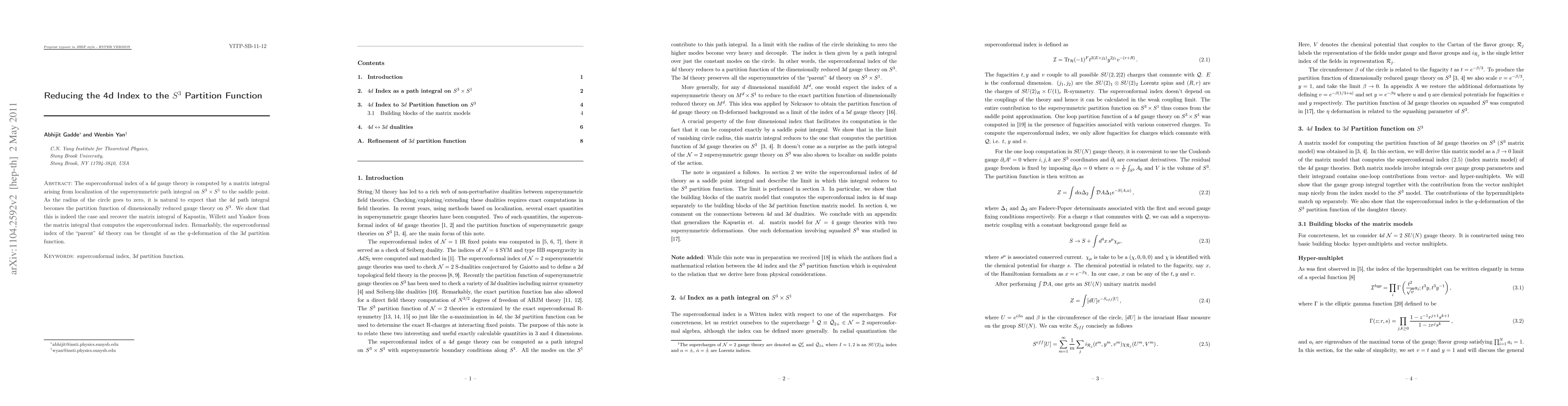 The paper demonstrates the equivalence between the superconformal index of a 4d gauge theory and the partition function of a dimensionally reduced theory on S^3, revealing a matrix integral connection to the work of Kapustin, Willett, and Yaakov, and showing the superconformal index as a q-deformation of the 3d partition function.