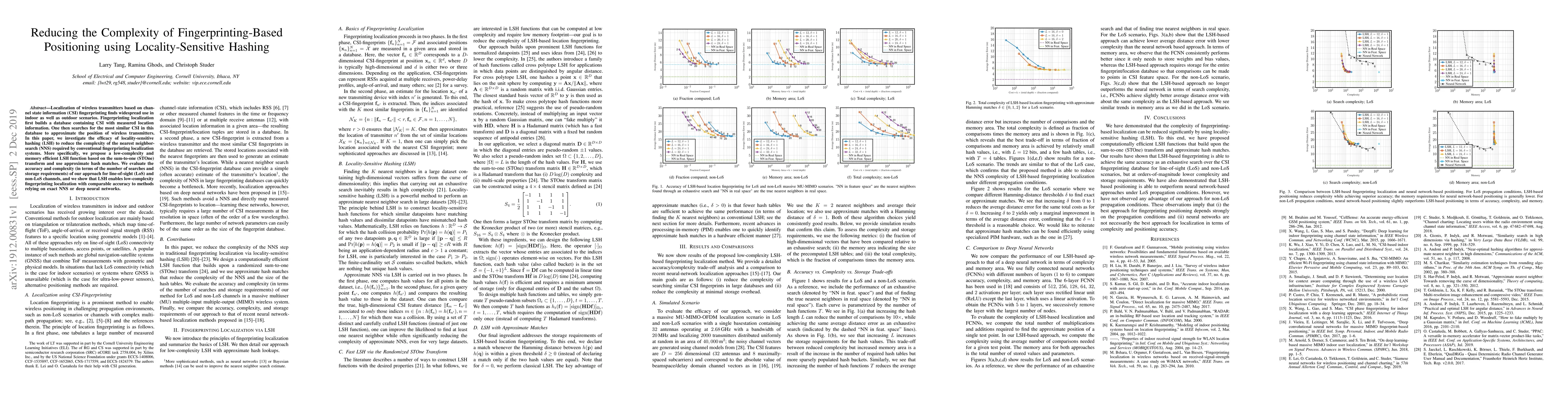This paper proposes a low-complexity, memory-efficient LSH method using the STOne transform for fingerprinting-based localization, achieving comparable accuracy to conventional methods while significantly reducing search complexity and storage requirements.