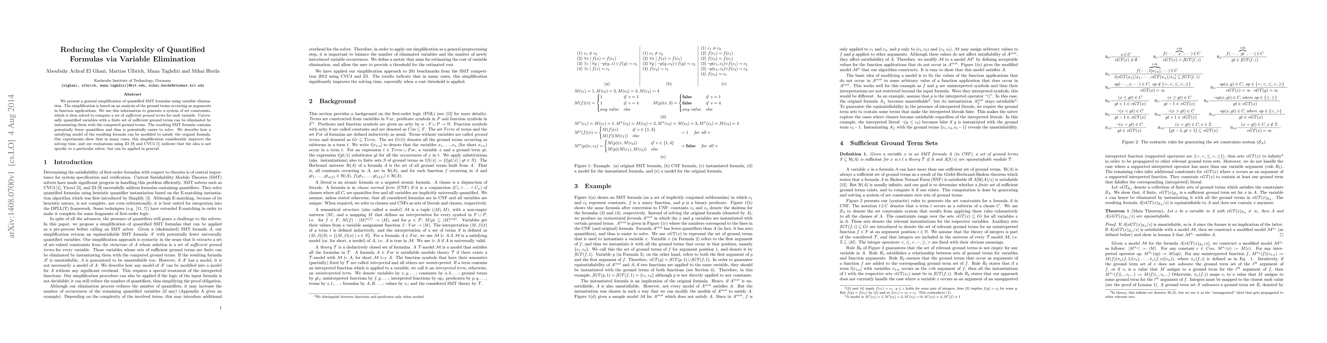 The paper presents a simplification technique for quantified SMT formulas using variable elimination based on ground term analysis and set constraints.