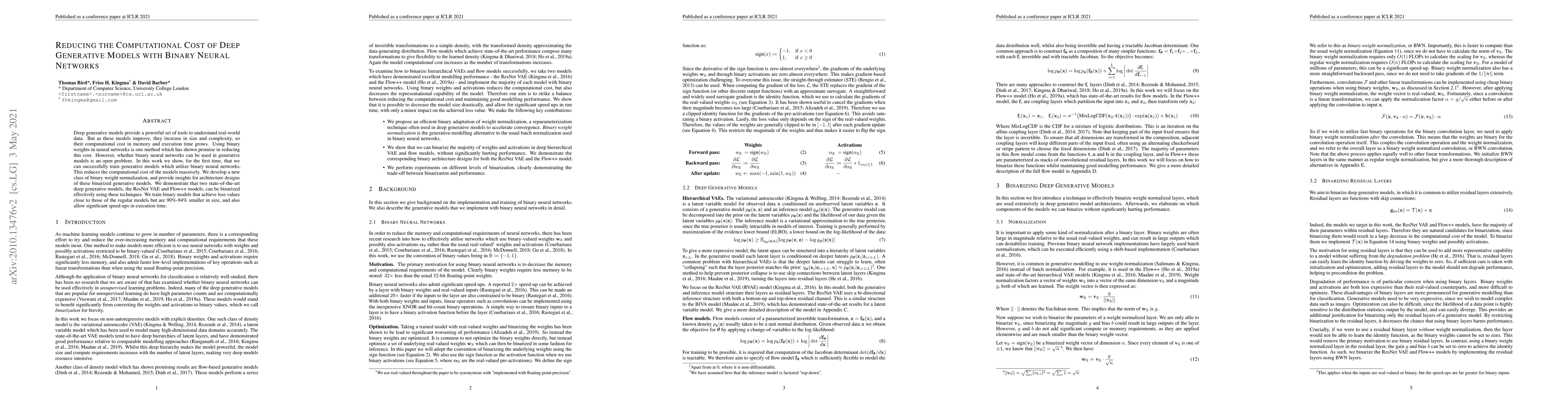 This paper demonstrates that binary neural networks can effectively reduce the computational cost of deep generative models, achieving significant reductions in model size and execution time while maintaining performance. The authors introduce a new binary weight normalization technique and show successful application to ResNet VAE and Flow++ models.