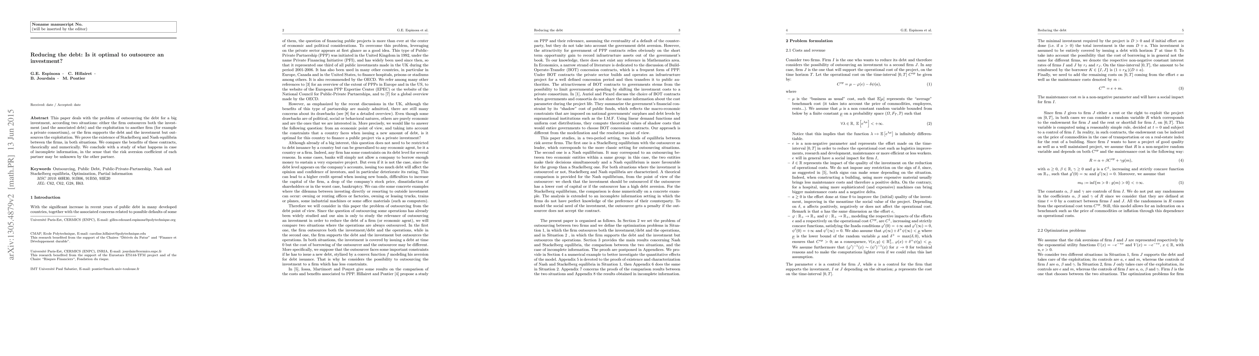We deal with the problem of outsourcing the debt for a big investment, according two situations: either the firm outsources both the investment (and the associated debt) and the exploitation to a private consortium, or the firm supports the debt and the investment but outsources the exploitation. We prove the existence of Stackelberg and Nash equilibria between the firm and the private consortium, in both situations. We compare the benefits of these contracts. We conclude with a study of what happens in case of incomplete information, in the sense that the risk aversion coefficient of each partner may be unknown by the other partner.