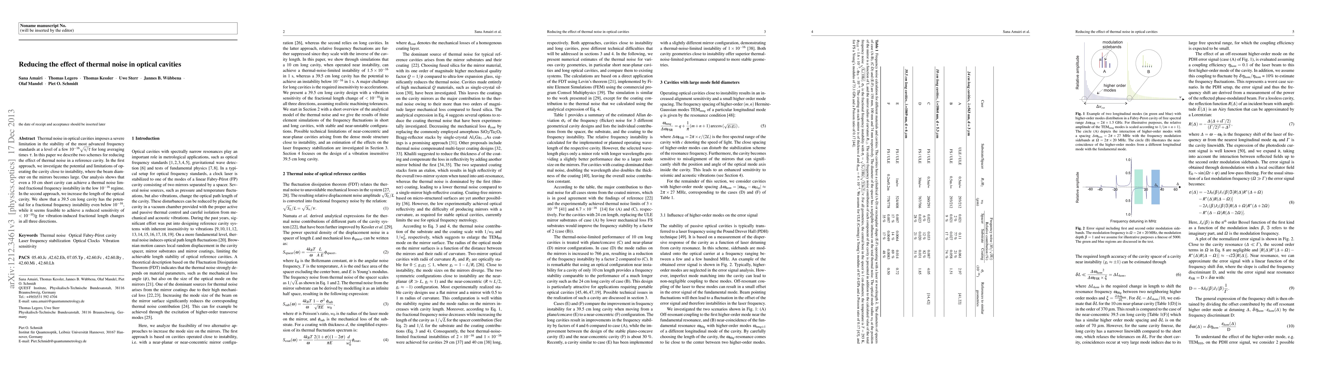 Thermal noise in optical cavities imposes a severe limitation in the stability of the most advanced frequency standards at a level of a few 10^(-16) (s/t)^(1/2) for long averaging times t. In this paper we describe two schemes for reducing the effect of thermal noise in a reference cavity. In the first approach, we investigate the potential and limitations of operating the cavity close to instability, where the beam diameter on the mirrors becomes large. Our analysis shows that even a 10 cm short cavity can achieve a thermal noise limited fractional frequency instability in the low 10^(-16) regime. In the second approach, we increase the length of the optical cavity. We show that a 39.5 cm long cavity has the potential for a fractional frequency instability even below 10^(-16), while it seems feasible to achieve a reduced sensitivity of <10^(-10)/g for vibration-induced fractional length changes in all three directions.