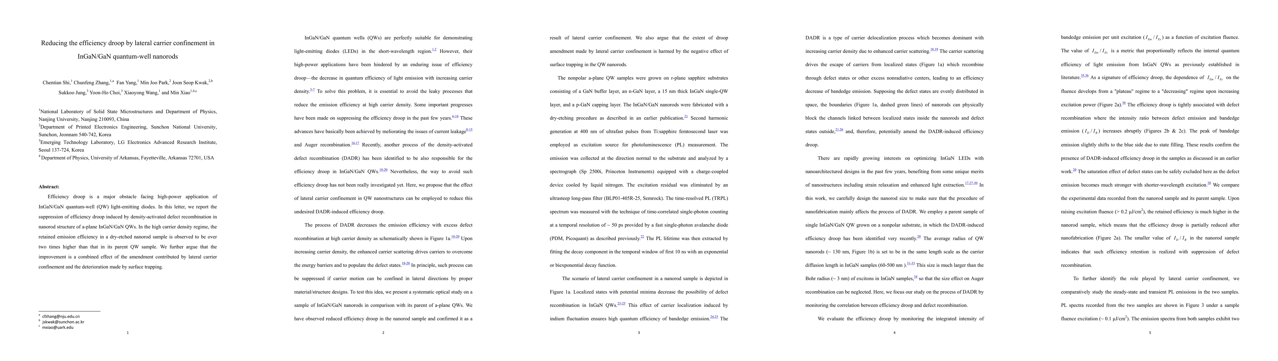 This paper reports the suppression of efficiency droop in InGaN/GaN quantum-well nanorods by lateral carrier confinement, achieving over double the emission efficiency compared to conventional quantum-well samples, primarily due to reduced density-activated defect recombination. The improvement is attributed to both enhanced carrier confinement and surface trapping effects.