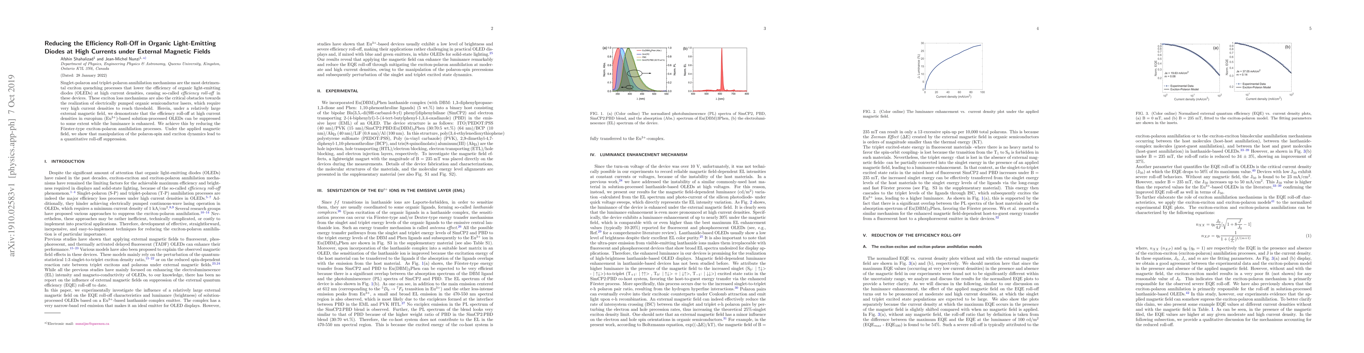 This paper demonstrates that applying an external magnetic field can suppress efficiency roll-off in europium (Eu3+)-based OLEDs at high current densities by reducing exciton-polaron annihilation processes, thereby enhancing luminance and improving device performance. The magnetic field manipulates polaron-spin and exciton dynamics to achieve this roll-off suppression.