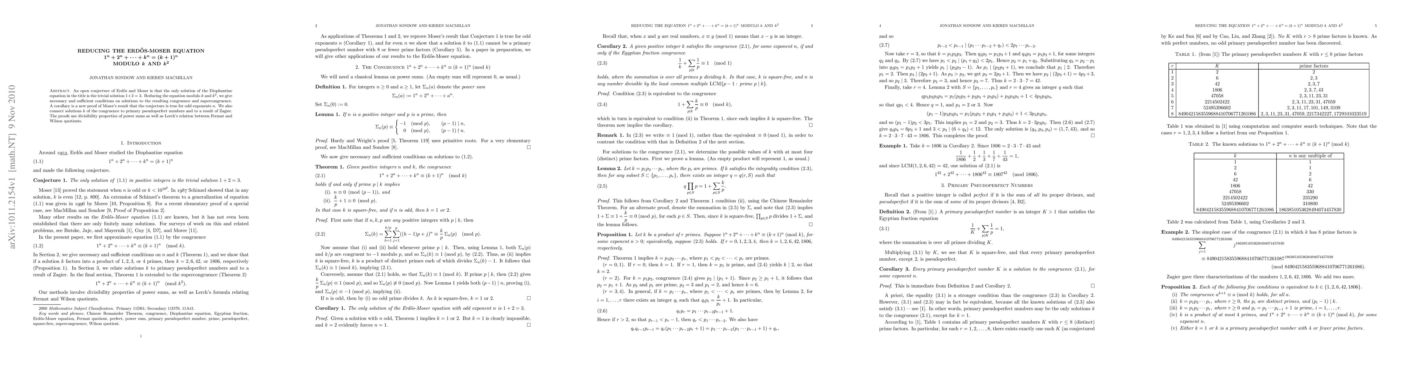An open conjecture of Erdos and Moser is that the only solution of the Diophantine equation in the title is the trivial solution 1+2=3. Reducing the equation modulo k and k^2, we give necessary and sufficient conditions on solutions to the resulting congruence and supercongruence. A corollary is a new proof of Moser's result that the conjecture is true for odd exponents n. We also connect solutions k of the congruence to primary pseudoperfect numbers and to a result of Zagier. The proofs use divisibility properties of power sums as well as Lerch's relation between Fermat and Wilson quotients.