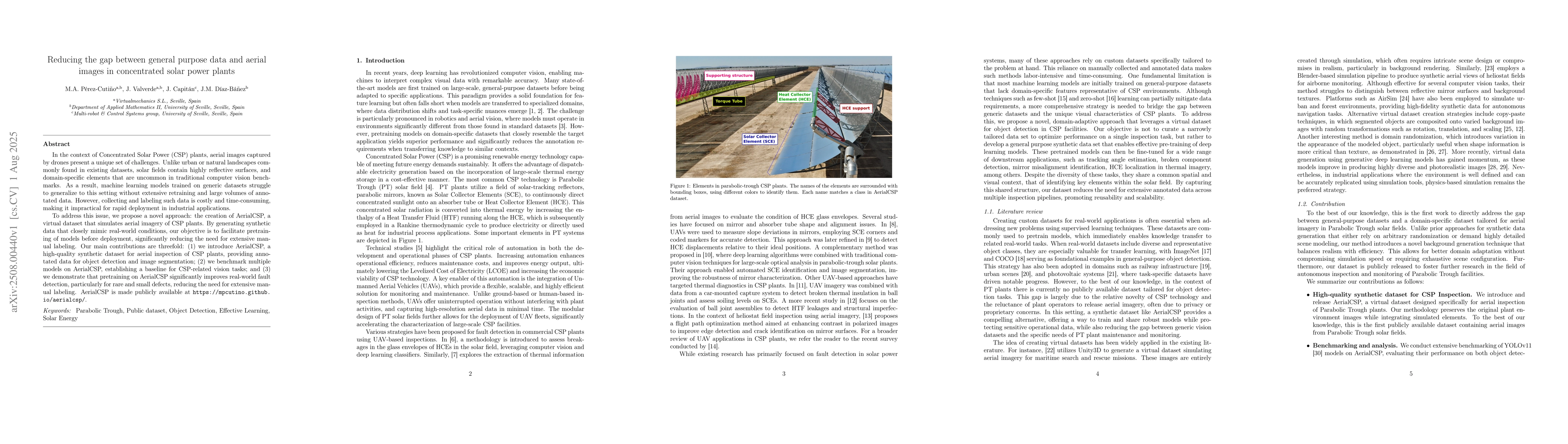 In the context of Concentrated Solar Power (CSP) plants, aerial images captured by drones present a unique set of challenges. Unlike urban or natural landscapes commonly found in existing datasets, solar fields contain highly reflective surfaces, and domain-specific elements that are uncommon in traditional computer vision benchmarks. As a result, machine learning models trained on generic datasets struggle to generalize to this setting without extensive retraining and large volumes of annotated data. However, collecting and labeling such data is costly and time-consuming, making it impractical for rapid deployment in industrial applications. To address this issue, we propose a novel approach: the creation of AerialCSP, a virtual dataset that simulates aerial imagery of CSP plants. By generating synthetic data that closely mimic real-world conditions, our objective is to facilitate pretraining of models before deployment, significantly reducing the need for extensive manual labeling. Our main contributions are threefold: (1) we introduce AerialCSP, a high-quality synthetic dataset for aerial inspection of CSP plants, providing annotated data for object detection and image segmentation; (2) we benchmark multiple models on AerialCSP, establishing a baseline for CSP-related vision tasks; and (3) we demonstrate that pretraining on AerialCSP significantly improves real-world fault detection, particularly for rare and small defects, reducing the need for extensive manual labeling. AerialCSP is made publicly available at https://mpcutino.github.io/aerialcsp/.