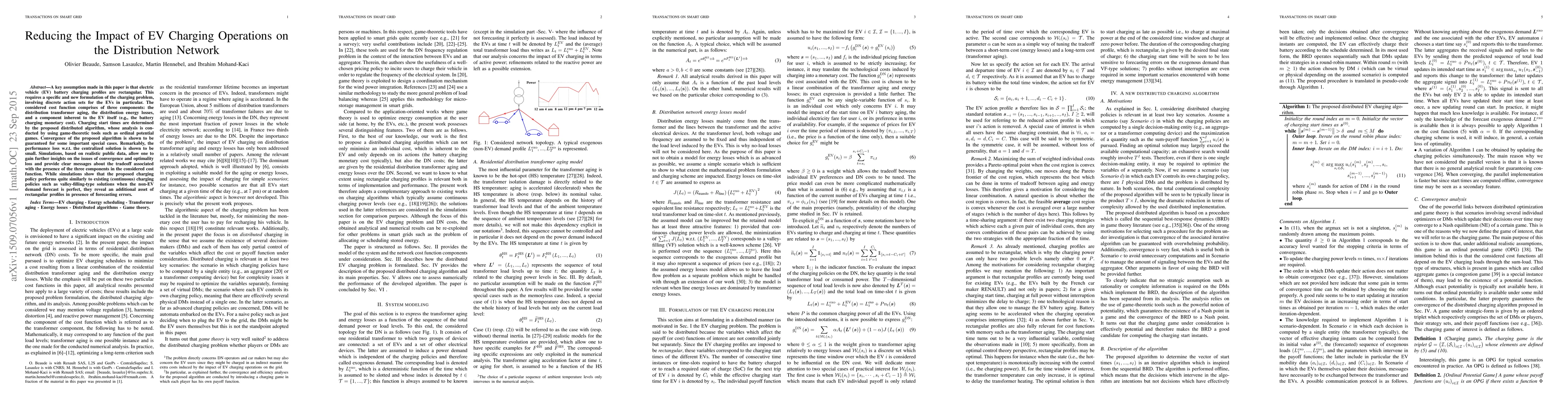 This paper proposes a distributed algorithm for optimizing EV charging profiles to minimize the impact on the distribution network, focusing on transformer aging, energy losses, and EV charging costs. The algorithm's convergence and performance are analyzed using game-theoretic tools, showing minimal loss compared to centralized solutions, and simulations reveal benefits of rectangular charging profiles under forecasting errors.
