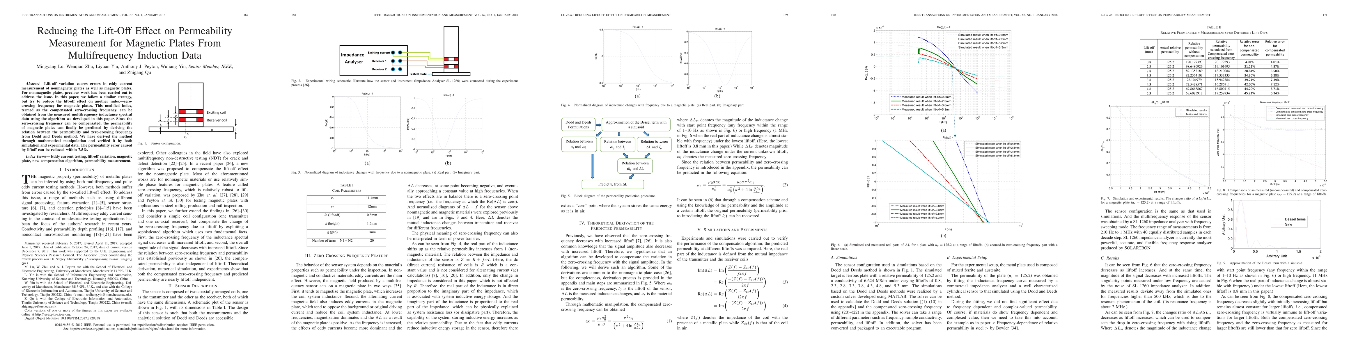 Liftoff variation causes errors in eddy current measurement of nonmagnetic plates as well as magnetic plates. For nonmagnetic plates, previous work has been carried out to address the issue. In this paper, we follow a similar strategy, but try to reduce the lift-off effect on another index, zerocrossing frequency for magnetic plates. This modified index, termed as the compensated zero-crossing frequency, can be obtained from the measured multifrequency inductance spectral data using the algorithm we developed in this paper. Since the zero-crossing frequency can be compensated, the permeability of magnetic plates can finally be predicted by deriving the relation between the permeability and zero-crossing frequency from Dodd and Deeds method. We have derived the method through mathematical manipulation and verified it by both simulation and experimental data. The permeability error caused by liftoff can be reduced within 7.5%.