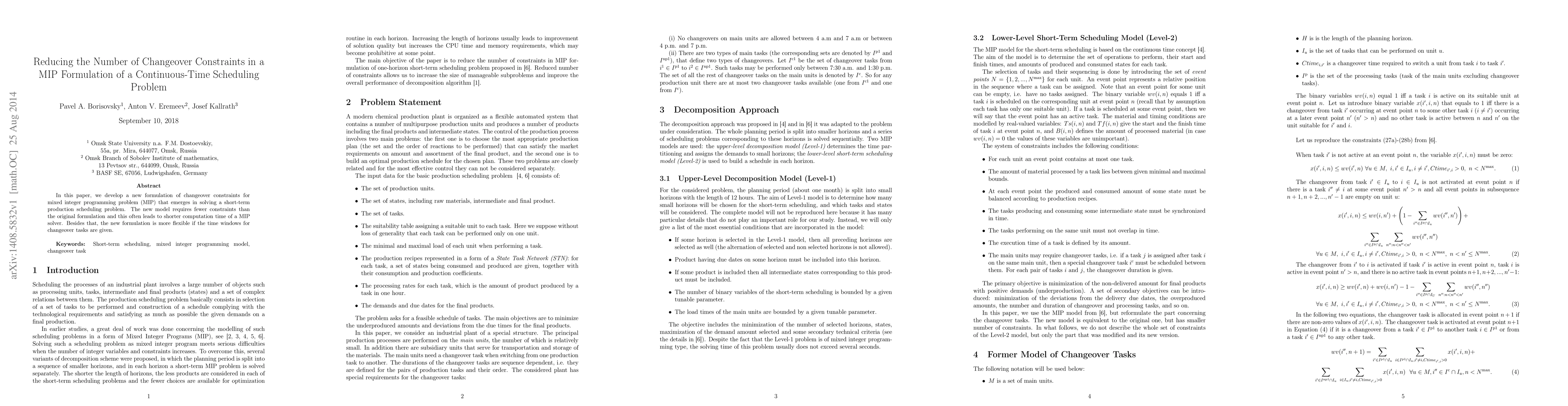 This research introduces a novel MIP formulation for short-term production scheduling, reducing changeover constraints and computation time. The new model is also more adaptable for tasks with specified time windows.