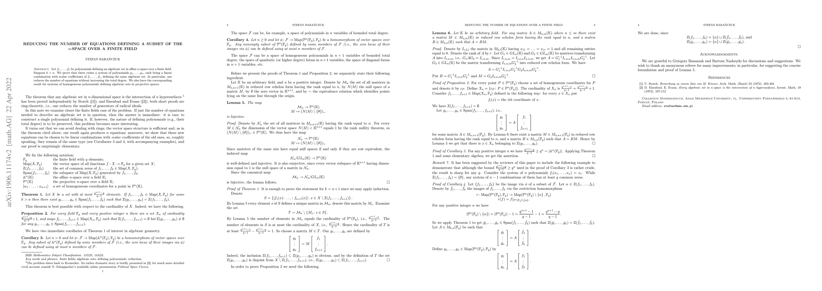Let $f_{1}, \ldots, f_{k}$ be polynomials defining an algebraic set in affine $n$-space over a finite field. Suppose $k>n$. We prove that there exists a system of polynomials $g_{1}, \ldots, g_{n}$, each being a linear combination with scalar coefficients of $f_{1}, \ldots, f_{k}$, defining the same algebraic set. In particular, one reduces the number of equations without increasing the total degree. We also have the corresponding result for systems of homogeneous polynomials defining algebraic sets in projective spaces.