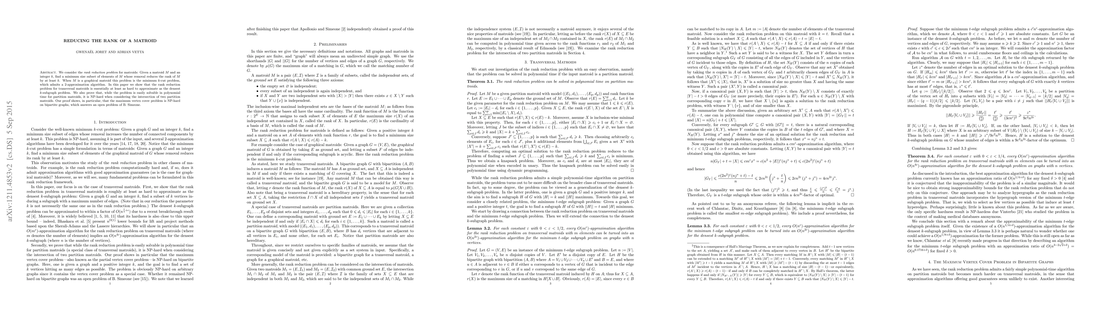 This paper explores the rank reduction problem in matroids, demonstrating that it is NP-hard for transversal matroids and partition matroid intersections, while providing polynomial-time solutions for partition matroids. It also establishes the NP-hardness of the maximum vertex cover problem on bipartite graphs.