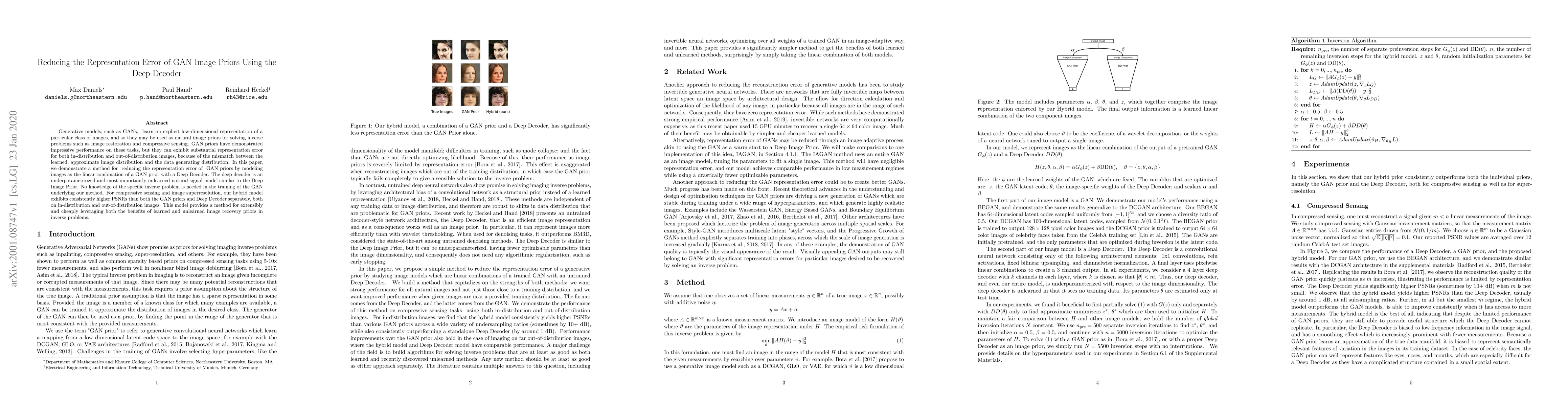 This paper proposes a hybrid model combining GAN image priors with a Deep Decoder to reduce representation error, achieving better performance in image restoration and compressive sensing tasks compared to using either component alone. The Deep Decoder, an unlearned natural signal model, enhances the GAN prior without requiring knowledge of the specific inverse problem.