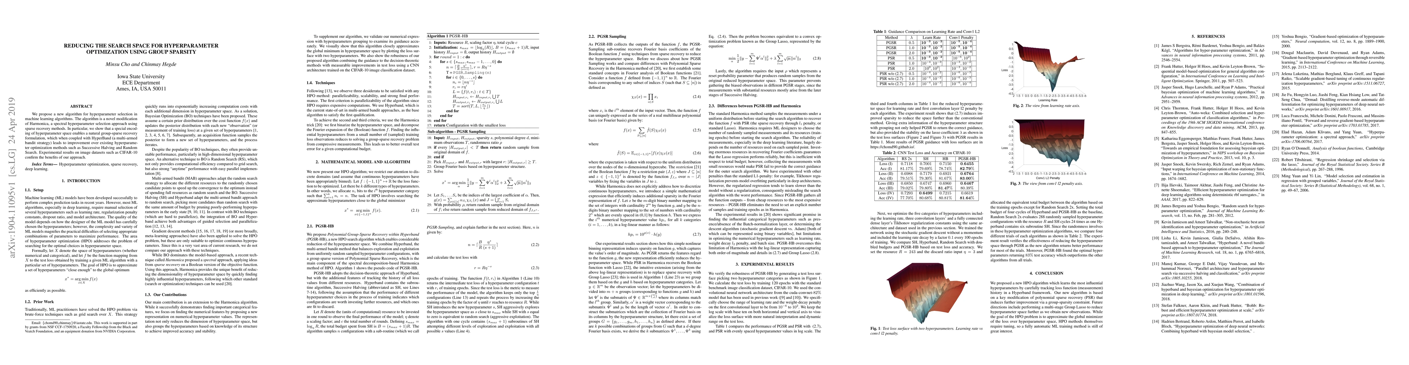 This paper introduces a new algorithm for hyperparameter optimization that leverages group sparsity and a modified Harmonica approach, combined with HyperBand, to outperform existing methods like Successive Halving and Random Search. Experimental validation on image datasets, such as CIFAR-10, demonstrates the effectiveness of the proposed method.