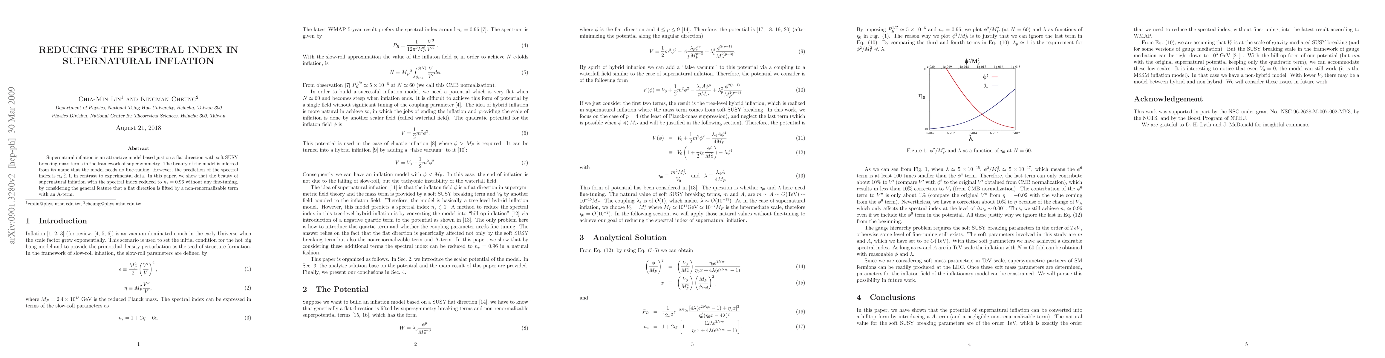 This paper proposes a method to reduce the spectral index in supernatural inflation to $n_s=0.96$ without requiring fine-tuning, by incorporating a non-renormalizable term with an A-term that lifts the flat direction in the model. This adjustment aligns the theoretical prediction with experimental data.