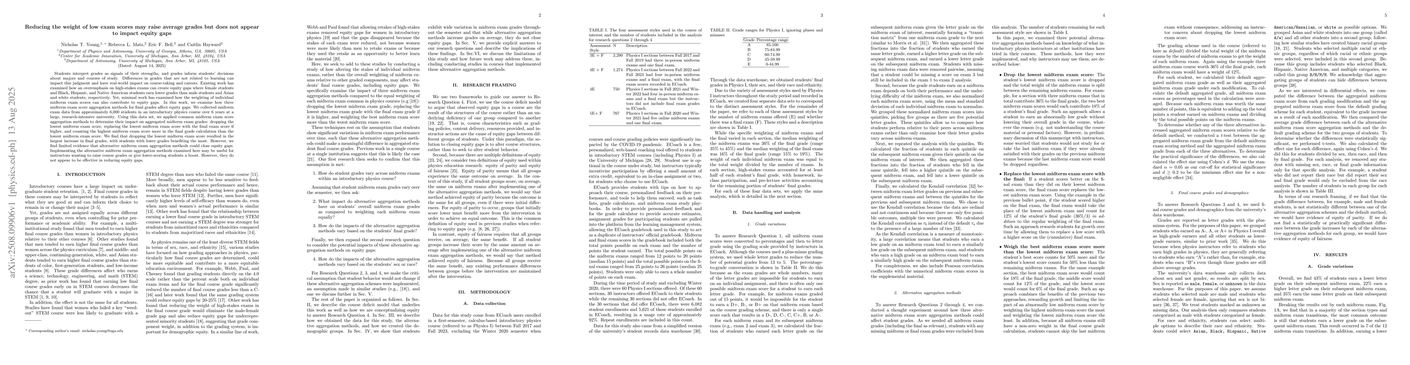 Students interpret grades as signals of their strengths, and grades inform students' decisions about majors and courses of study. Differences in grades that are not related to learning can impact this judgment and have real-world impact on course-taking and careers. Existing work has examined how an overemphasis on high-stakes exams can create equity gaps where female students and Black, Hispanic, and Native American students earn lower grades than male students and Asian and white students, respectively. Yet, minimal work has examined how the weighting of individual midterm exam scores can also contribute to equity gaps. In this work, we examine how three midterm exam score aggregation methods for final grades affect equity gaps. We collected midterm exam data from approximately 6,000 students in an introductory physics course over 6 years at a large, research-intensive university. Using this data set, we applied common midterm exam score aggregation methods to determine their impact on aggregated midterm exam grades: dropping the lowest midterm exam score, replacing the lowest midterm exam score with the final exam score if higher, and counting the highest midterm exam score more in the final grade calculation than the lowest midterm exam score. We find that dropping the lowest midterm exam score resulted in the largest increase in final grades, with students with lower grades benefiting the most. However, we find limited evidence that alternative midterm exam aggregation methods could close equity gaps. Implementing the alternative midterm exam aggregation methods examined here may be useful for instructors wanting to raise course grades or give lower-scoring students a boost. However, they do not appear to be effective in reducing equity gaps.