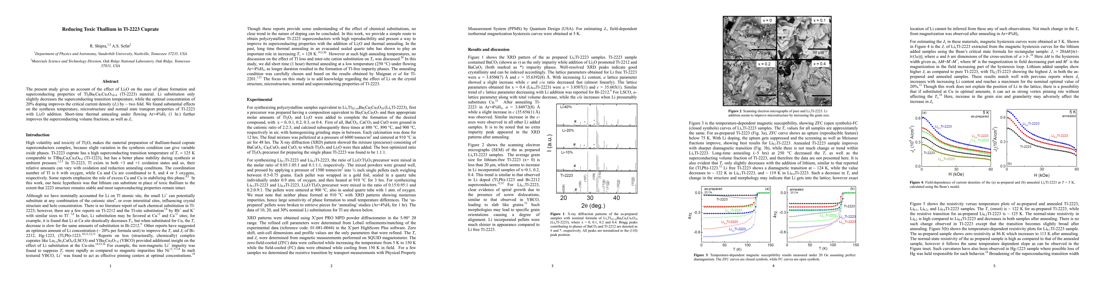 The present study gives an account of the effect of Li2O on the ease of phase formation and superconducting properties of Tl2Ba2Ca2Cu3O10+x (Tl-2223) material. Li substitution only slightly decreases the superconducting transition temperature, while the optimal concentration of 20% doping improves the critical current density (Jc) by ~ two fold. We found substantial effects on the synthesis temperature, microstructure and normal state transport properties of Tl-2223 with Li2O addition. Short-time thermal annealing under flowing Ar+4%H2 (1 hr.) further improves the superconducting volume fractions, as well as Jc.