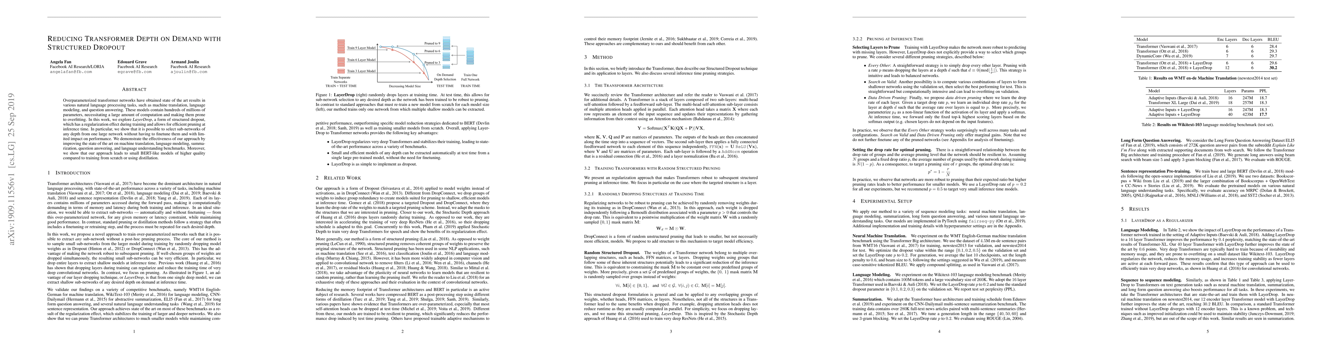 Overparameterized transformer networks have obtained state of the art results in various natural language processing tasks, such as machine translation, language modeling, and question answering. These models contain hundreds of millions of parameters, necessitating a large amount of computation and making them prone to overfitting. In this work, we explore LayerDrop, a form of structured dropout, which has a regularization effect during training and allows for efficient pruning at inference time. In particular, we show that it is possible to select sub-networks of any depth from one large network without having to finetune them and with limited impact on performance. We demonstrate the effectiveness of our approach by improving the state of the art on machine translation, language modeling, summarization, question answering, and language understanding benchmarks. Moreover, we show that our approach leads to small BERT-like models of higher quality compared to training from scratch or using distillation.