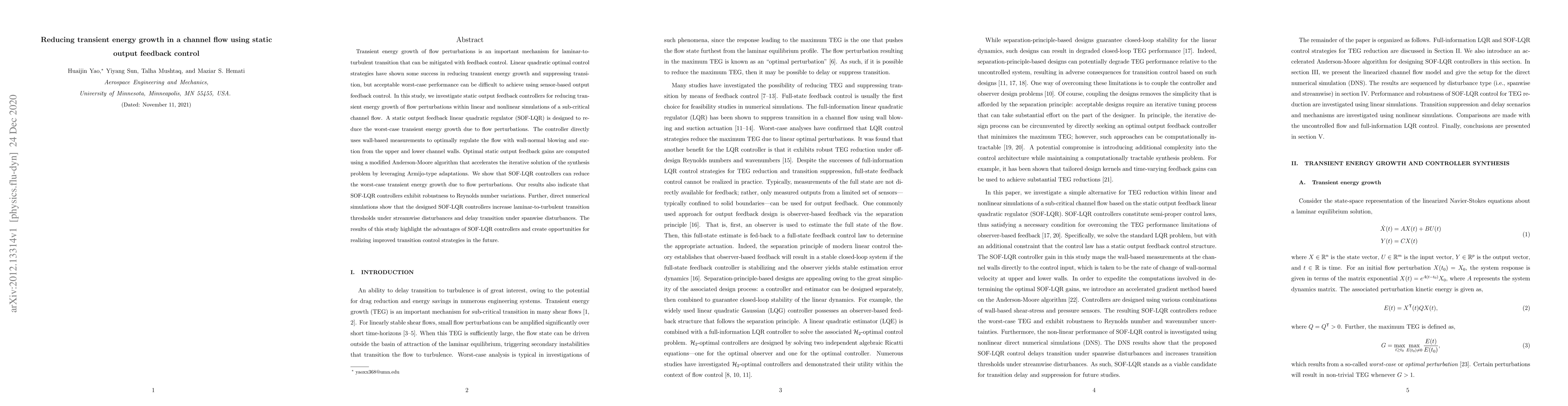 This study investigates static output feedback linear quadratic regulators (SOF-LQR) to reduce transient energy growth in sub-critical channel flow, demonstrating their effectiveness in delaying laminar-to-turbulent transition through wall-normal blowing and suction. The designed controllers show robustness to Reynolds number variations and improve transition thresholds.