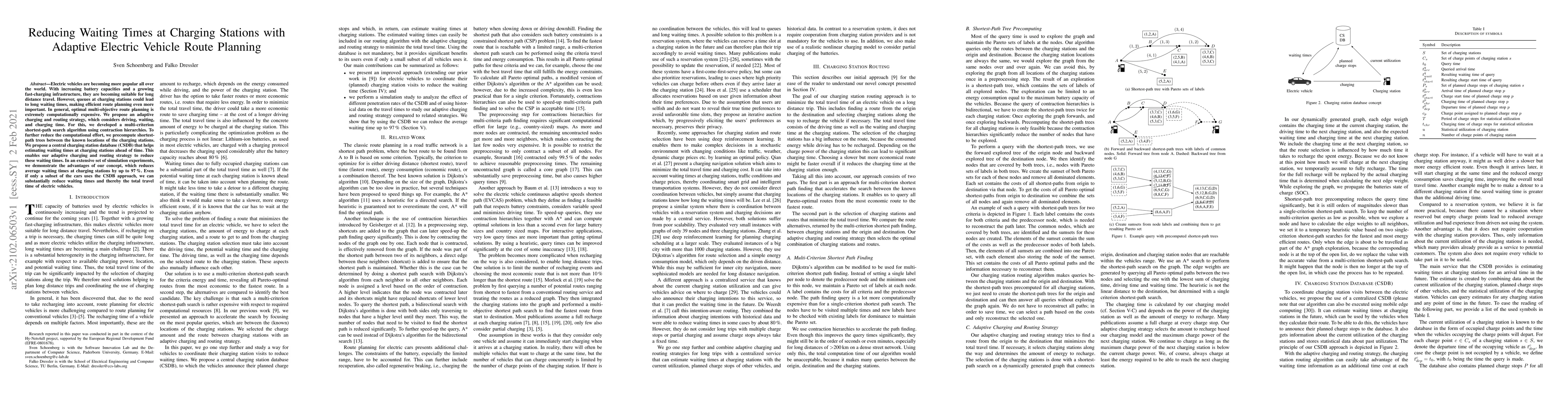 Electric vehicles are becoming more popular all over the world. With increasing battery capacities and a growing fast-charging infrastructure, they are becoming suitable for long distance travel. However, queues at charging stations could lead to long waiting times, making efficient route planning even more important. In general, optimal multi-objective route planning is extremely computationally expensive. We propose an adaptive charging and routing strategy, which considers driving, waiting, and charging time. For this, we developed a multi-criterion shortest-path search algorithm using contraction hierarchies. To further reduce the computational effort, we precompute shortest-path trees between the known locations of the charging stations. We propose a central charging station database (CSDB) that helps estimating waiting times at charging stations ahead of time. This enables our adaptive charging and routing strategy to reduce these waiting times. In an extensive set of simulation experiments, we demonstrate the advantages of our concept, which reduces average waiting times at charging stations by up to 97 %. Even if only a subset of the cars uses the CSDB approach, we can substantially reduce waiting times and thereby the total travel time of electric vehicles.