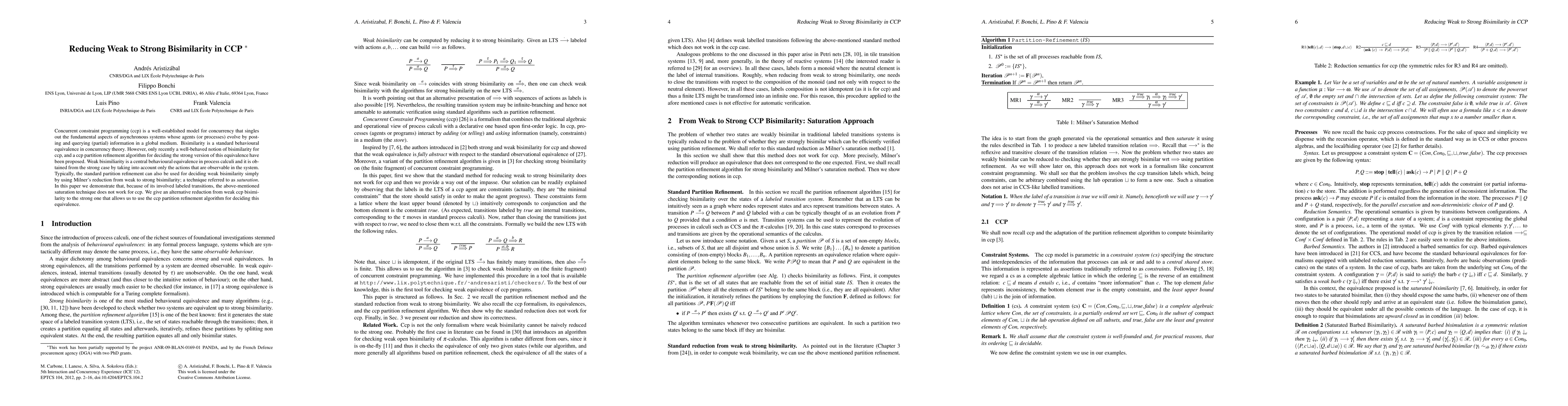This paper introduces an alternative method for reducing weak to strong bisimilarity in concurrent constraint programming (CCP) to leverage CCP's partition refinement algorithm. Unlike traditional saturation techniques, the proposed reduction directly addresses the complexities of CCP's labeled transitions, thereby enabling effective equivalence checking.