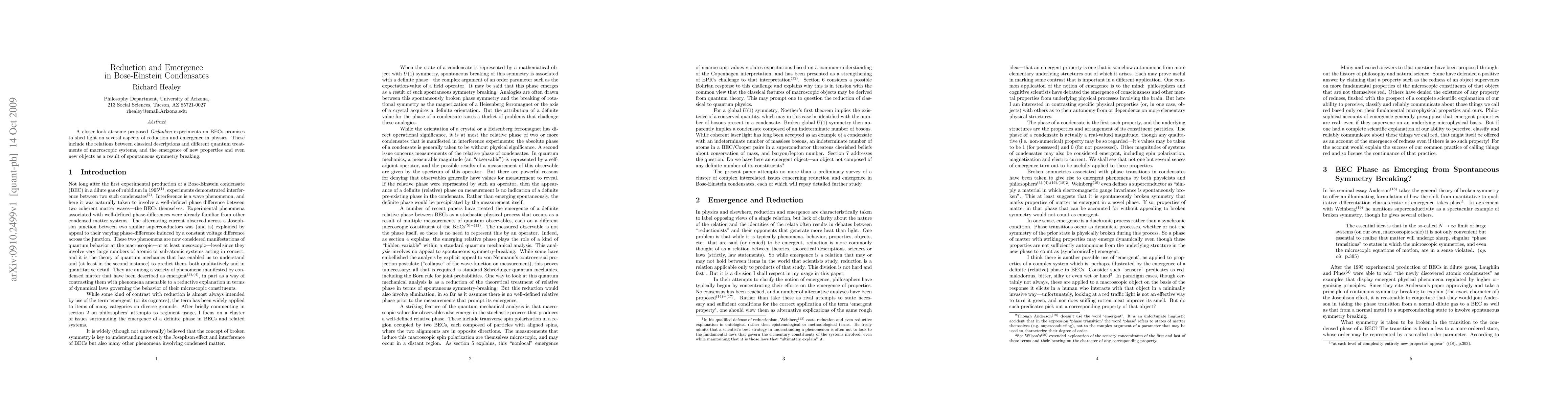 A closer look at some proposed Gedanken-experiments on BECs promises to shed light on several aspects of reduction and emergence in physics. These include the relations between classical descriptions and different quantum treatments of macroscopic systems, and the emergence of new properties and even new objects as a result of spontaneous symmetry breaking.