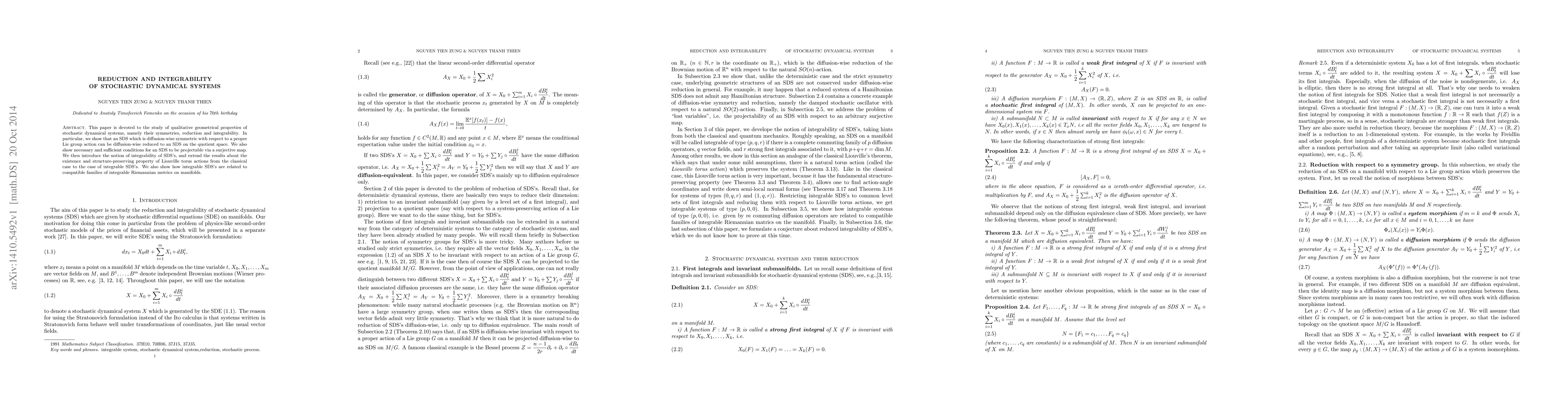 This paper explores symmetries, reduction, and integrability in stochastic dynamical systems (SDS), demonstrating how diffusion-wise symmetric SDS can be reduced to quotient spaces and presenting conditions for projectability. It extends classical results on Liouville torus actions and links integrable SDS to compatible families of integrable Riemannian metrics.