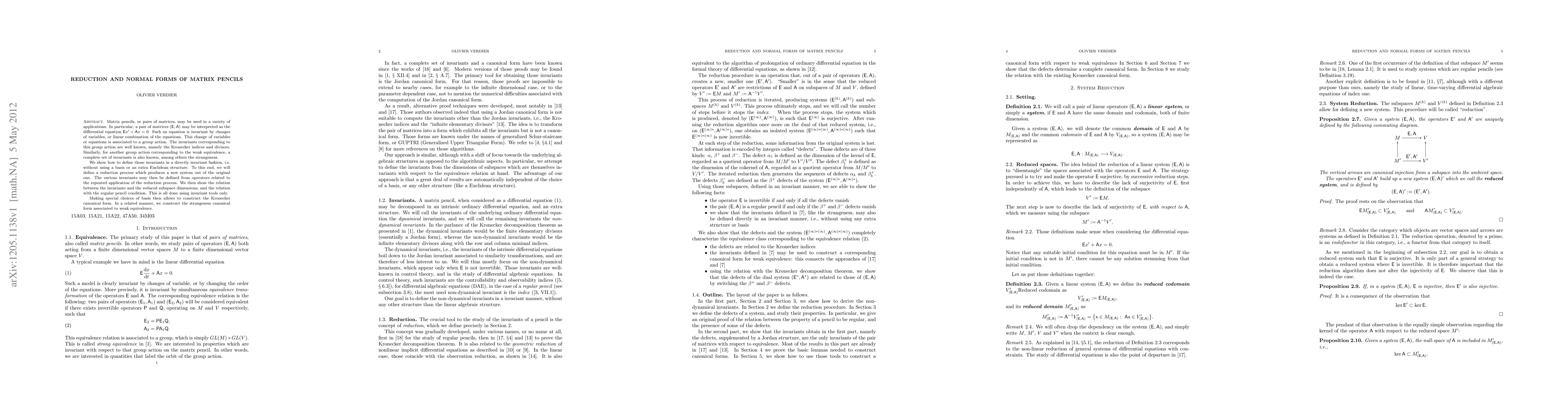 Matrix pencils, or pairs of matrices, may be used in a variety of applications. In particular, a pair of matrices (E,A) may be interpreted as the differential equation E x' + A x = 0. Such an equation is invariant by changes of variables, or linear combination of the equations. This change of variables or equations is associated to a group action. The invariants corresponding to this group action are well known, namely the Kronecker indices and divisors. Similarly, for another group action corresponding to the weak equivalence, a complete set of invariants is also known, among others the strangeness. We show how to define those invariants in a directly invariant fashion, i.e. without using a basis or an extra Euclidean structure. To this end, we will define a reduction process which produces a new system out of the original one. The various invariants may then be defined from operators related to the repeated application of the reduction process. We then show the relation between the invariants and the reduced subspace dimensions, and the relation with the regular pencil condition. This is all done using invariant tools only. Making special choices of basis then allows to construct the Kronecker canonical form. In a related manner, we construct the strangeness canonical form associated to weak equivalence.